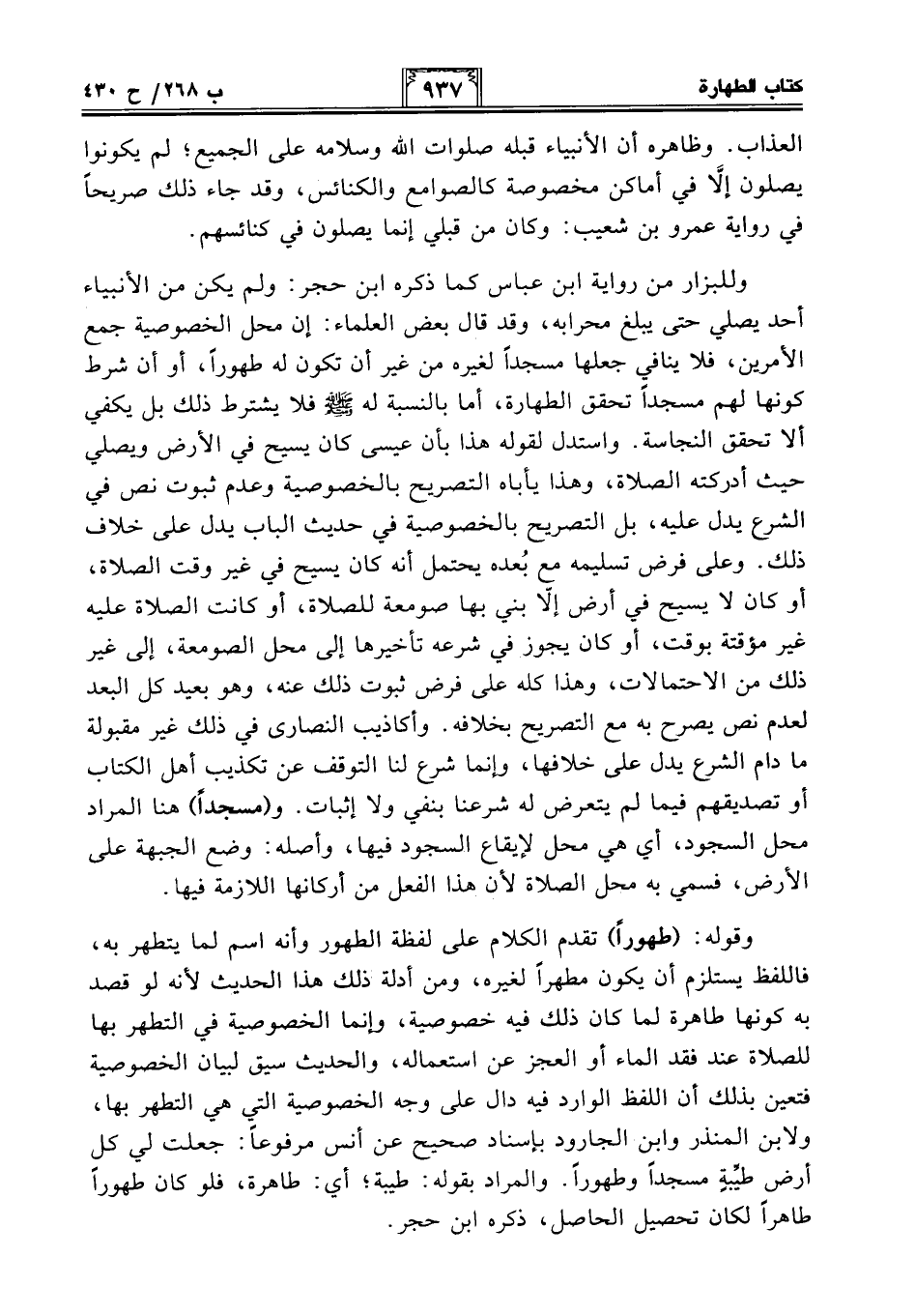 وللبزار من رواية ابن عباس كما ذكره ابن حجر: ولم يكن من الأنبياء أحد يصلي حتى يبلغ محرابه، وقد قال بعض العلماء: إن محل الخصوصية جمع الأمرين، فلا ينافي جعلها مسجدًا لغيره من غير أن تكون له طهورًا، أو أن شرط كونها لهم مسجدًا تحقق الطهارة، أما بالنسبة له - صلى الله عليه وسلم - فلا يشترط ذلك بل يكفي ألا تحقق النجاسة. واستدل لقوله هذا بأن عيسى كان يسيح في الأرض ويصلي حيث أدركته الصلاة، وهذا يأباه التصريح بالخصوصية وعدم ثبوت نص في الشرع يدل عليه، بل التصريح بالخصوصية في حديث الباب يدل على خلاف ذلك. وعلى فرض تسليمه مع بُعده يحتمل أنه كان يسيح في غير وقت الصلاة، أو كان لا يسيح في أرض إلَّا بني بها صومعة للصلاة، أو كانت الصلاة عليه غير مؤقتة بوقت، أو كان يجوز في شرعه تأخيرها إلى محل الصومعة، إلى غير ذلك من الإحتمالات، وهذا كله على فرض ثبوت ذلك عنه، وهو بعيد كل البعد لعدم نص يصرح به مع التصريح بخلافه. وأكاذيب النصارى في ذلك غير مقبولة مادام الشرع يدل على خلافها، وإنما شرع لنا التوقف عن تكذيب أهل الكتاب أو تصديقهم فيما لم يتعرض له شرعنا بنفي ولا إثبات. و (مسجدًا) هنا المراد محل السجود، أي هي محل لإيقاع السجود فيها، وأصله: وضع الجبهة على الأرض، فسمي به محل الصلاة لأن هذا الفعل من أركانها اللازمة فيها.