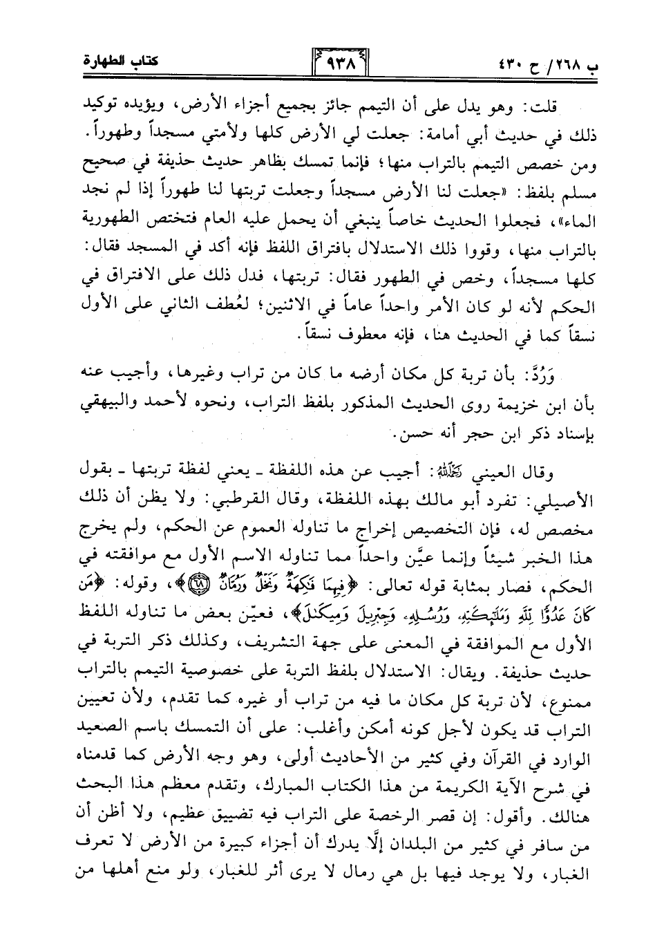 وقال العيني -رحمه الله-: أجيب عن هذه اللفظة -يعني لفظة تربتها- بقول الأصيلي: تفرد أبو مالك بهذه اللفظة، وقال القرطبي: ولا يظن أن ذلك مخصص له، فإن التخصيص إخراج ما تناوله العموم عن الحكم، ولم يخرج هذا الخبر شيئًا وإنما عيَّن واحدًا مما تناوله الاسم الأول مع موافقته في الحكم، فصار بمثابة قوله تعالى: {فِيهِمَا فَاكِهَةٌ وَنَخْلٌ وَرُمَّانٌ (68)}، وقوله: {مَنْ كَانَ عَدُوًّا لِلَّهِ وَمَلَائِكَتِهِ وَرُسُلِهِ وَجِبْرِيلَ وَمِيكَالَ}، فعيّن بعض ما تناوله اللفظ الأول مع الموافقة في المعنى على جهة التشريف، وكذلك ذكر التربة في حديث حذيفة. ويقال: الإستدلال بلفظ التربة على خصوصية التيمم بالتراب ممنوع، لأن تربة كل مكان ما فيه من تراب أو غيره كما تقدم، ولأن تعيين التراب قد يكون لأجل كونه أمكن وأغلب: على أن التمسك باسم الصعيد الوارد في القرآن وفي كثير من الأحاديث أولى، وهو وجه الأرض كما قدمناه في شرح الآية الكريمة من هذا الكتاب المبارك، وتقدم معظم هذا البحث هنالك. وأقول: إن قصر الرخصة على التراب فيه تضييق عظيم، ولا أظن أن من سافر في كثير من البلدان إلَّا يدرك أن أجزاء كبيرة من الأرض لا تعرف الغبار، ولا يوجد فيها بل هي رمال لا يرى أثر للغبار، ولو منع أهلها من