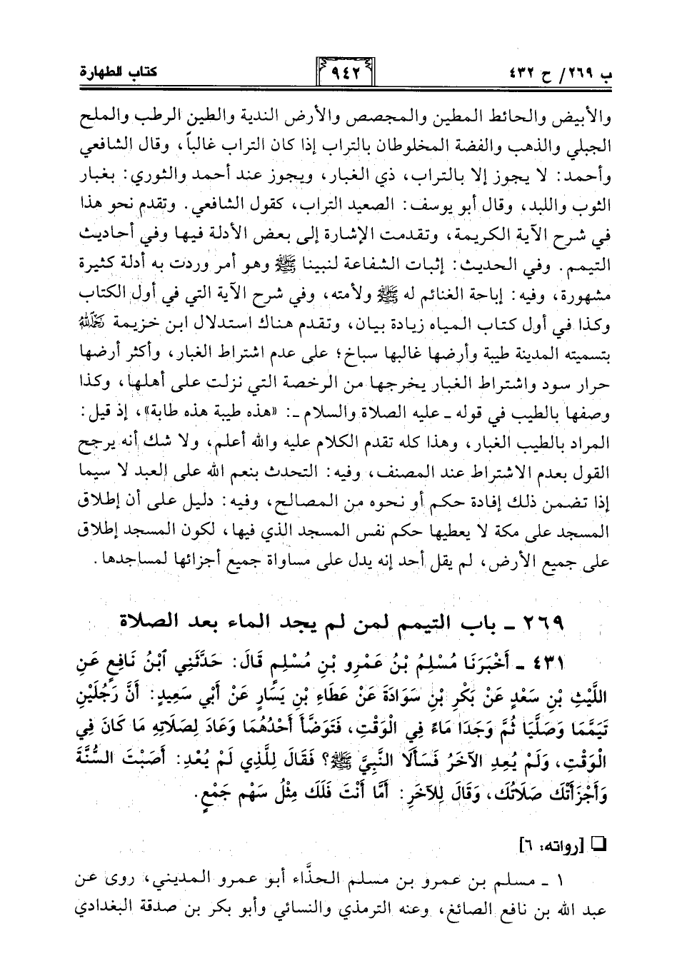 431 - أَخْبَرَنَا مُسْلِمُ بْنُ عَمْرِو بْنِ مُسْلِمٍ قَالَ: حَدَّثَنِي ابْنُ نَافِعٍ عَنِ اللَّيْثِ بْنِ سَعْدٍ عَنْ بَكْرِ بْنِ سَوَادَةَ عَنْ عَطَاءِ بْنِ يَسَارٍ عَنْ أَبِي سَعِيدٍ: أَنَّ رَجُلَيْنِ تَيَمَّمَا وَصَلَّيَا ثُمَّ وَجَدَا مَاءً فِي الْوَقْتِ، فَتَوَضَّأَ أَحَدُهُمَا وَعَادَ لِصَلَاتِهِ مَا كَانَ فِي الْوَقْتِ وَلَمْ يُعِدِ الآخَرُ فَسَأَلَا النَّبِيَّ - صلى الله عليه وسلم -؟ فَقَالَ لِلَّذِي لَمْ يُعِدْ: أَصَبْتَ السُّنَّةَ وَأَجْزَأَتْكَ صَلَاتُكَ، وَقَالَ لِلآخَرِ: أَمَّا أَنْتَ فَلَكَ مِثْلُ سَهْمِ جَمْعٍ.