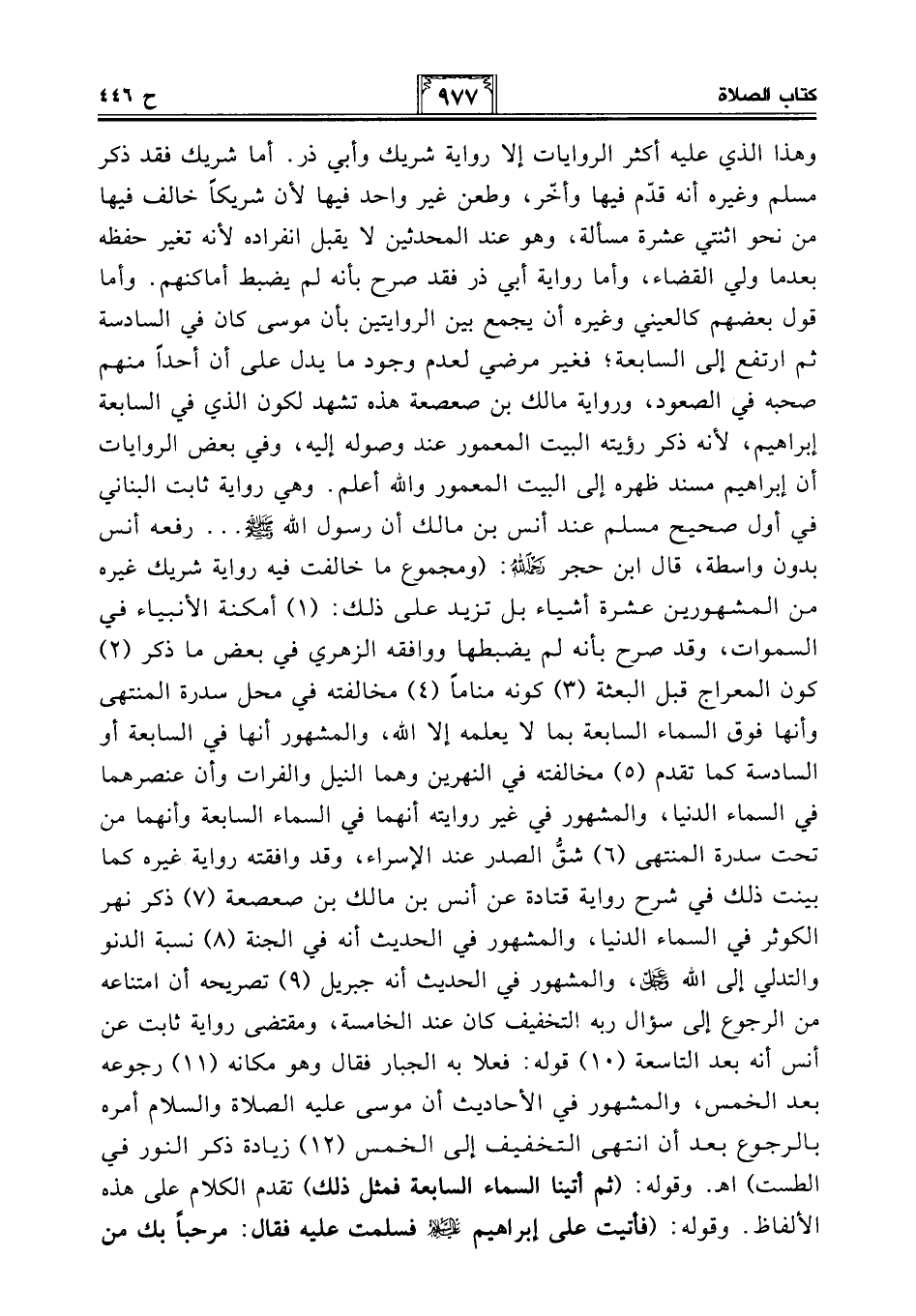 وهذا الذي عليه أكثر الروايات إلا رواية شريك وأبي ذر. أما شريك فقد ذكر مسلم وغيره أنه قدّم فيها وأخّر، وطعن غير واحد فيها لأن شريكًا خالف فيها من نحو اثنتي عشرة مسألة، وهو عند المحدثين لا يقبل انفراده لأنه تغير حفظه بعدما ولي القضاء، وأما رواية أبي ذر فقد صرح بأنه لم يضبط أماكنهم. وأما قول بعضهم كالعيني وغيره أن يجمع بين الروايتين بأن موسى كان في السادسة ثم ارتفع إلى السابعة؛ فغير مرضي لعدم وجود ما يدل على أن أحدًا منهم صحبه في الصعود، ورواية مالك بن صعصعة هذه تشهد لكون الذي في السابعة إبراهيم، لأنه ذكر رؤيته البيت المعمور عند وصوله إليه، وفي بعض الروايات أن إبراهيم مسند ظهره إلى البيت المعمور والله أعلم. وهي رواية ثابت البناني في أول صحيح مسلم عند أنس بن مالك أن رسول الله - صلى الله عليه وسلم -. . . رفعه أنس بدون واسطة، قال ابن حجر -رحمه الله-: (ومجموع ما خالفت فيه رواية شريك غيره من المشهورين عشرة أشياء بل تزيد على ذلك: (1) أمكنة الأنبياء في السموات، وقد صرح بأنه لم يضبطها ووافقه الزهري في بعض ما ذكر (2) كون المعراج قبل البعثة (3) كونه منامًا (4) مخالفته في محل سدرة المنتهى وأنها فوق السماء السابعة بما لا يعلمه إلا الله، والمشهور أنها في السابعة أو السادسة كما تقدم (5) مخالفته في النهرين وهما النيل والفرات وأن عنصرهما في السماء الدنيا، والمشهور في غير روايته أنهما في السماء السابعة وأنهما من تحت سدرة المنتهى (6) شقُّ الصدر عند الإسراء، وقد وافقته رواية غيره كما بينت ذلك في شرح رواية قتادة عن أنس بن مالك بن صعصعة (7) ذكر نهر الكوثر في السماء الدنيا، والمشهور في الحديث أنه في الجنة (8) نسبة الدنو والتدلي إلى الله -عز وجل-، والمشهور في الحديث أنه جبريل (9) تصريحه أن امتناعه من الرجوع إلى سؤال ربه التخفيف كان عند الخامسة، ومقتضى رواية ثابت عن أنس أنه بعد التاسعة (10) قوله: فعلا به الجبار فقال وهو مكانه (11) رجوعه بعد الخمس، والمشهور في الأحاديث أن موسى عليه الصلاة والسلام أمره بالرجوع بعد أن انتهى التخفيف إلى الخمس (12) زيادة ذكر النور في الطست) اهـ. وقوله: (ثم أتينا السماء السابعة فمثل ذلك) تقدم الكلام على هذه الألفاظ. وقوله: (فأتيت على إبراهيم -عليه السلام- فسلمت عليه فقال: مرحبًا بك من