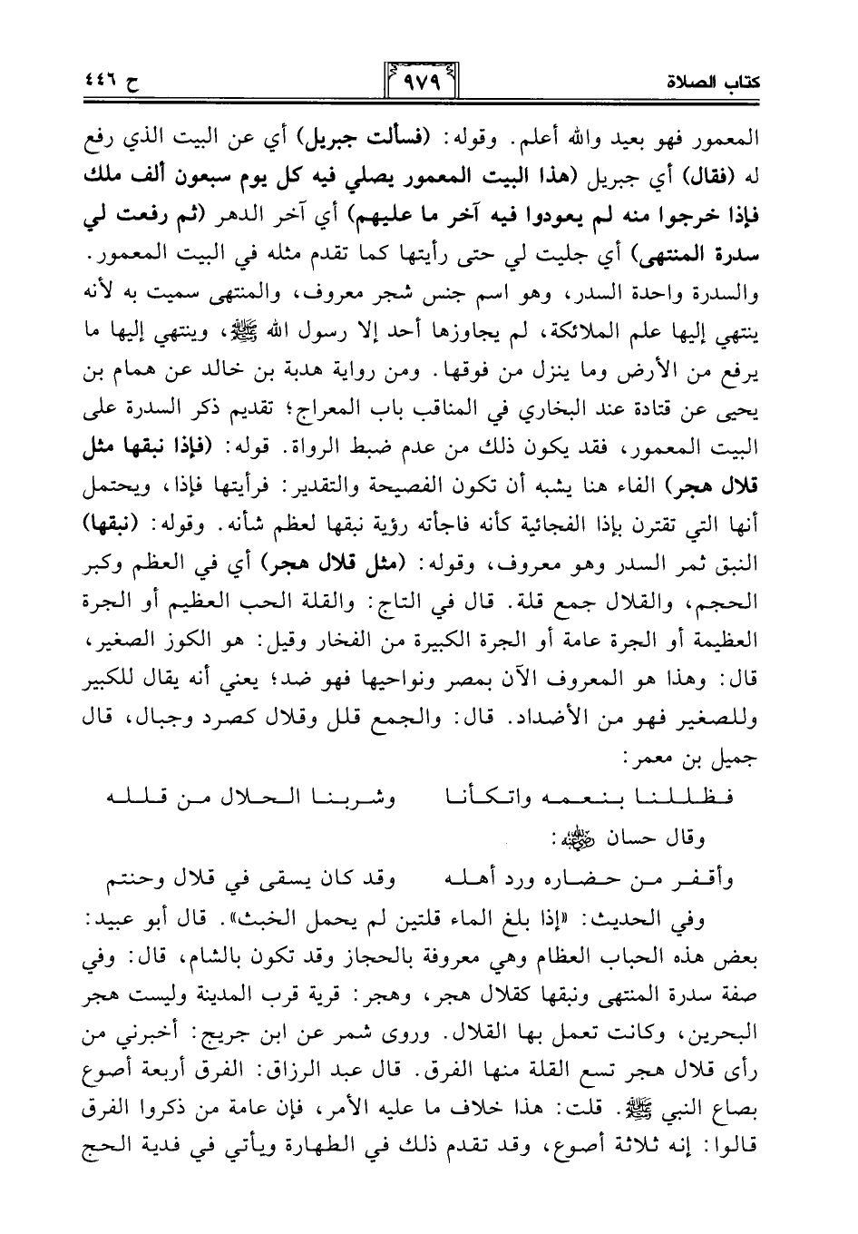 المعمور فهو بعيد والله أعلم. وقوله: (فسألت جبريل) أي عن البيت الذي رفع له (فقال) أي جبريل (هذا البيت المعمور يصلي فيه كل يوم سبعون ألف ملك فإذا خرجوا منه لم يعودوا فيه آخر ما عليهم) أي آخر الدهر (ثم رفعت لي سدرة المنتهى) أي جليت لي حتى رأيتها كما تقدم مثله في البيت المعمور. والسدرة واحدة السدر، وهو اسم جنس شجر معروف، والمنتهى سميت به لأنه ينتهي إليها علم الملائكة، لم يجاوزها أحد إلا رسول الله - صلى الله عليه وسلم -، وينتهي إليها ما يرفع من الأرض وما ينزل من فوقها. ومن رواية هدبة بن خالد عن همام بن يحيى عن قتادة عند البخاري في المناقب باب المعراج؛ تقديم ذكر السدرة على البيت المعمور، فقد يكون ذلك من عدم ضبط الرواة. قوله: (فإذا نبقها مثل قلال هجر) الفاء هنا يشبه أن تكون الفصيحة والتقدير: فرأيتها فإذا، ويحتمل أنها التي تقترن بإذا الفجائية كأنه فاجأته رؤية نبقها لعظم شأنه. وقوله: (نبقها) النبق ثمر السدر وهو معروف، وقوله: (مثل قلال هجر) أي في العظم وكبر الحجم، والقلال جمع قلة. قال في التاج: والقلة الحب العظيم أو الجرة العظيمة أو الجرة عامة أو الجرة الكبيرة من الفخار وقيل: هو الكوز الصغير، قال: وهذا هو المعروف الآن بمصر ونواحيها فهو ضد؛ يعني أنه يقال للكبير وللصغير فهو من الأضداد. قال: والجمع قلل وقلال كصرد وجبال، قال جميل بن معمر: