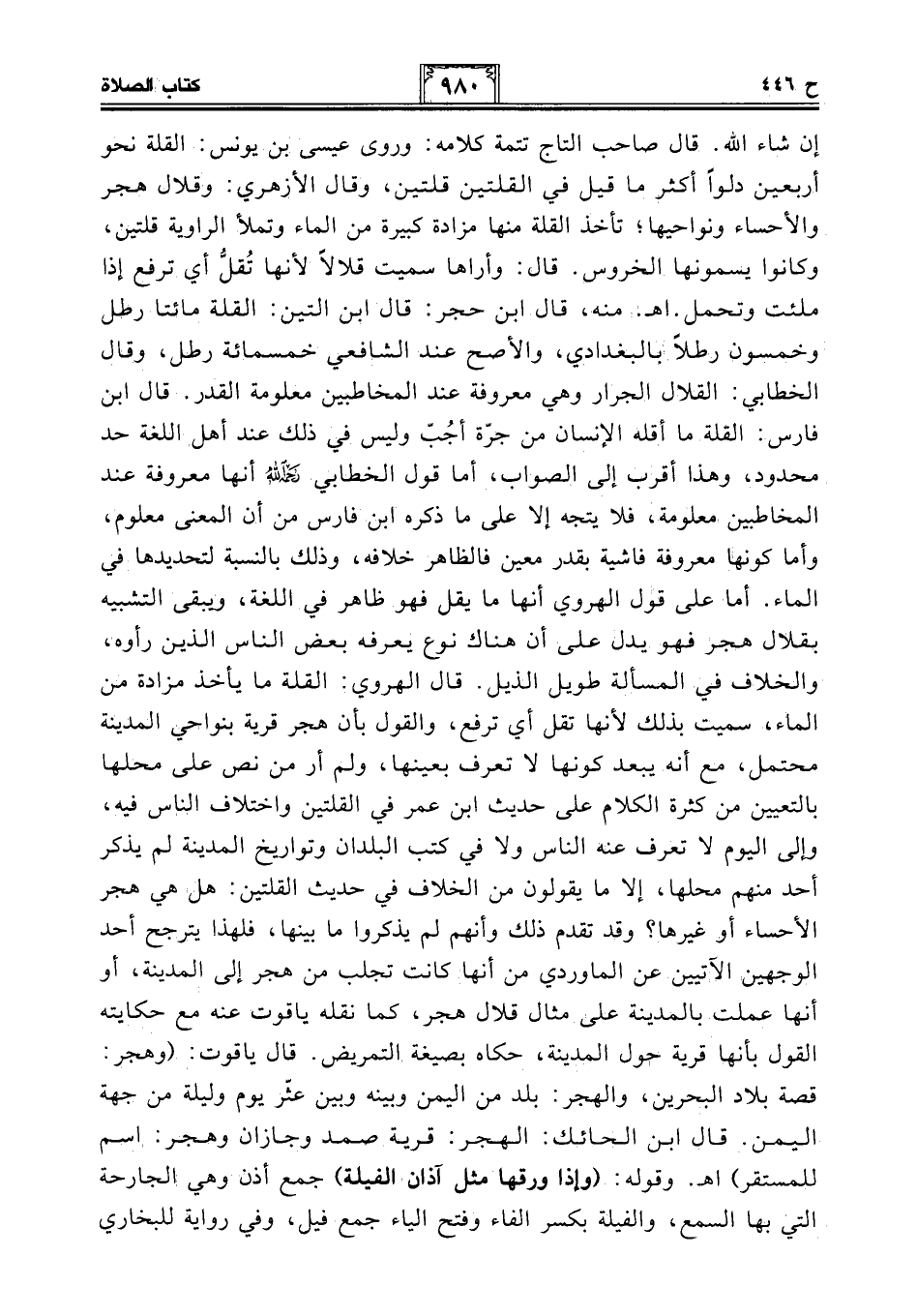 إن شاء الله. قال صاحب التاج تتمة كلامه: وروى عيسى بن يونس: القلة نحو أربعين دلوًا أكثر ما قيل في القلتين قلتين، وقال الأزهري: وقلال هجر والأحساء ونواحيها؛ تأخذ القلة منها مزادة كبيرة من الماء وتملأ الراوية قلتين، وكانوا يسمونها الخروس. قال: وأراها سميت قلالًا لأنها تُقلُّ أي ترفع إذا ملئت وتحمل. اهـ. منه، قال ابن حجر: قال ابن التين: القلة مائتا رطل وخمسون رطلًا بالبغدادي، والأصح عند الشافعي خمسمائة رطل، وقال الخطابي: القلال الجرار وهي معروفة عند المخاطبين معلومة القدر. قال ابن فارس: القلة ما أقله الإنسان من جرّة أجُبّ وليس في ذلك عند أهل اللغة حد محدود، وهذا أقرب إلى الصواب، أما قول الخطابي -رحمه الله- أنها معروفة عند المخاطبين معلومة، فلا يتجه إلا على ما ذكره ابن فارس من أن المعنى معلوم، وأما كونها معروفة فاشية بقدر معين فالظاهر خلافه، وذلك بالنسبة لتحديدها في الماء. أما على قول الهروي أنها ما يقل فهو ظاهر في اللغة، ويبقى التشبيه بقلال هجر فهو يدل على أن هناك نوع يعرفه بعض الناس الذين رأوه، والخلاف في المسألة طويل الذيل. قال الهروي: القلة ما يأخذ مزادة من الماء، سميت بذلك لأنها تقل أي ترفع، والقول بأن هجر قرية بنواحي المدينة محتمل، مع أنه يبعد كونها لا تعرف بعينها، ولم أر من نص على محلها بالتعيين من كثرة الكلام على حديث ابن عمر في القلتين واختلاف الناس فيه، وإلى اليوم لا تعرف عنه الناس ولا في كتب البلدان وتواريخ المدينة لم يذكر أحد منهم محلها، إلا ما يقولون من الخلاف في حديث القلتين: هل هي هجر الأحساء أو غيرها؟ وقد تقدم ذلك وأنهم لم يذكروا ما بينها، فلهذا يترجح أحد الوجهين الآتيين عن الماوردي من أنها كانت تجلب من هجر إلى المدينة، أو أنها عملت بالمدينة على مثال قلال هجر، كما نقله ياقوت عنه مع حكايته القول بأنها قرية حول المدينة، حكاه بصيغة التمريض. قال ياقوت: (وهجر: قصة بلاد البحرين، والهجر: بلد من اليمن وبينه وبين عثّر يوم وليلة من جهة اليمن. قال ابن الحائك: الهجر: قرية صمد وجازان وهجر: اسم للمستقر) اهـ. وقوله: (وإذا ورقها مثل آذان الفيلة) جمع أذن وهي الجارحة التي بها السمع، والفيلة بكسر الفاء وفتح الياء جمع فيل، وفي رواية للبخاري