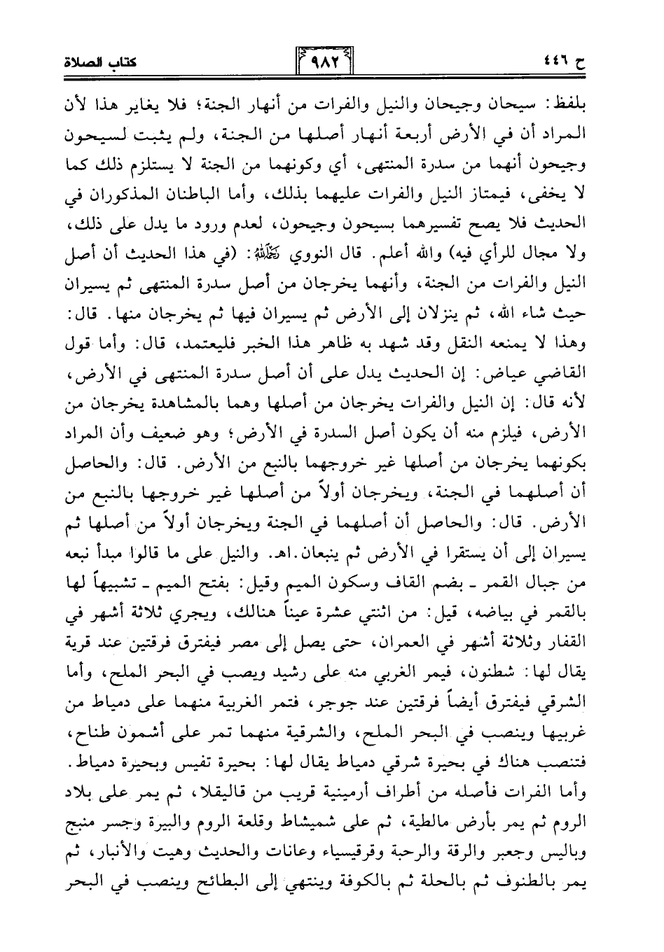 بلفظ: سيحان وجيحان والنيل والفرات من أنهار الجنة؛ فلا يغاير هذا لأن المراد أن في الأرض أربعة أنهار أصلها من الجنة، ولم يثبت لسيحون وجيحون أنهما من سدرة المنتهى، أي وكونهما من الجنة لا يستلزم ذلك كما لا يخفى، فيمتاز النيل والفرات عليهما بذلك، وأما الباطنان المذكوران في الحديث فلا يصح تفسيرهما بسيحون وجيحون، لعدم ورود ما يدل على ذلك، ولا مجال للرأي فيه) والله أعلم. قال النووي -رحمه الله-: (في هذا الحديث أن أصل النيل والفرات من الجنة، وأنهما يخرجان من أصل سدرة المنتهى ثم يسيران حيث شاء الله، ثم ينزلان إلى الأرض ثم يسيران فيها ثم يخرجان منها. قال: وهذا لا يمنعه النقل وقد شهد به ظاهر هذا الخبر فليعتمد، قال: وأما قول القاضي عياض: إن الحديث يدل على أن أصل سدرة المنتهى في الأرض، لأنه قال: إن النيل والفرات يخرجان من أصلها وهما بالمشاهدة يخرجان من الأرض، فيلزم منه أن يكون أصل السدرة في الأرض؛ وهو ضعيف وأن المراد بكونهما يخرجان من أصلها غير خروجهما بالنبع من الأرض. قال: والحاصل أن أصلهما في الجنة، ويخرجان أولًا من أصلها غير خروجها بالنبع من الأرض. قال: والحاصل أن أصلهما في الجنة ويخرجان أولًا من أصلها ثم يسيران إلى أن يستقرا في الأرض ثم ينبعان. اهـ. والنيل على ما قالوا مبدأ نبعه من جبال القمر -بضم القاف وسكون الميم وقيل: بفتح الميم- تشبيهًا لها بالقمر في بياضه، قيل: من اثنتي عشرة عينًا هنالك، ويجري ثلاثة أشهر في القفار وثلاثة أشهر في العمران، حتى يصل إلى مصر فيفترق فرقتين عند قرية يقال لها: شطنون، فيمر الغربي منه على رشيد ويصب في البحر الملح، وأما الشرقي فيفترق أيضًا فرقتين عند جوجر، فتمر الغربية منهما على دمياط من غربيها وينصب في البحر الملح، والشرقية منهما تمر على أشمون طناح، فتنصب هناك في بحيرة شرقي دمياط يقال لها: بحيرة تفيس وبحيرة دمياط. وأما الفرات فأصله من أطراف أرمينية قريب من قاليقلا، ثم يمر على بلاد الروم ثم يمر بأرض مالطية، ثم على شميشاط وقلعة الروم والبيرة وجسر منبج وباليس وجعبر والرقة والرحبة وقرقيسياء وعانات والحديث وهيت والأنبار، ثم يمر بالطنوف ثم بالحلة ثم بالكوفة وينتهي إلى البطائح وينصب في البحر