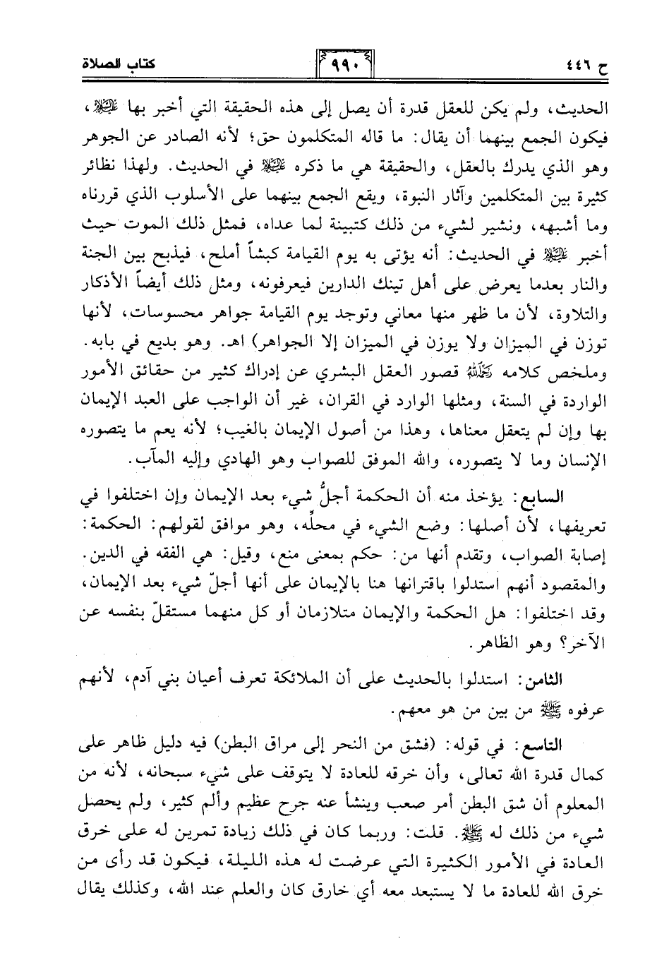 الحديث، ولم يكن للعقل قدرة أن يصل إلى هذه الحقيقة التي أخبر بها -عليه السلام-، فيكون الجمع بينهما أن يقال: ما قاله المتكلمون حق؛ لأنه الصادر عن الجوهر وهو الذي يدرك بالعقل، والحقيقة هي ما ذكره -عليه السلام- في الحديث. ولهذا نظائر كثيرة بين المتكلمين وآثار النبوة، ويقع الجمع بينهما على الأسلوب الذي قررناه وما أشبهه، ونشير لشيء من ذلك كتبينة لما عداه، فمثل ذلك الموت حيث أخبر -عليه السلام- في الحديث: أنه يؤتى به يوم القيامة كبشًا أملح، فيذبح بين الجنة والنار بعدما يعرض على أهل تينك الدارين فيعرفونه، ومثل ذلك أيضًا الأذكار والتلاوة، لأن ما ظهر منها معاني وتوجد يوم القيامة جواهر محسوسات، لأنها توزن في الميزان ولا يوزن في الميزان إلا الجواهر) اهـ. وهو بديع في بابه. وملخص كلامه -رحمه الله- قصور العقل البشري عن إدراك كثير من حقائق الأمور الواردة في السنة، ومثلها الوارد في القرآن، غير أن الواجب على العبد الإيمان بها وإن لم يتعقل معناها، وهذا من أصول الإيمان بالغيب؛ لأنه يعم ما يتصوره الإنسان وما لا يتصوره، والله الموفق للصواب وهو الهادي وإليه المآب.