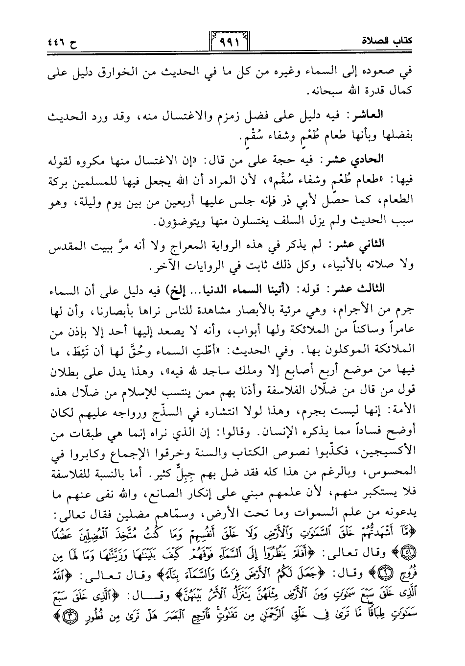 الثالث عشر: قوله: (أتينا السماء الدنيا. . . إلخ) فيه دليل على أن السماء جرم من الأجرام، وهي مرئية بالأبصار مشاهدة للناس نراها بأبصارنا، وأن لها عامرًا وساكنًا من الملائكة ولها أبواب، وأنه لا يصعد إليها أحد إلا بإذن من الملائكة الموكلون بها. وفي الحديث: "أطّتِ السماء وحُق لها أن تَئِطَ، ما فيها من موضع أربع أصابع إلا وملك ساجد لله فيه"، وهذا يدل على بطلان قول من قال من ضلّال الفلاسفة وأذنا بهم ممن ينتسب للإسلام من ضلّال هذه الأمة: إنها ليست بجرم، وهذا لولا انتشاره في السذج ورواجه عليهم لكان أوضح فسادًا مما يذكره الإنسان. وقالوا: إن الذي نراه إنما هي طبقات من الأكسيجين، فكذّبوا نصوص الكتاب والسنة وخرقوا الإجماع وكابروا في المحسوس، وبالرغم من هذا كله فقد ضل بهم جِبِلٌّ كثير. أما بالنسبة للفلاسفة فلا يستكبر منهم، لأن علمهم مبني على إنكار الصانع، والله نفى عنهم ما يدعونه من علم السموات وما تحت الأرض، وسمّاهم مضلين فقال تعالى: {مَا أَشْهَدْتُهُمْ خَلْقَ السَّمَاوَاتِ وَالْأَرْضِ وَلَا خَلْقَ أَنْفُسِهِمْ وَمَا كُنْتُ مُتَّخِذَ الْمُضِلِّينَ عَضُدًا (51)} وقال تعالى: {أَفَلَمْ يَنْظُرُوا إِلَى السَّمَاءِ فَوْقَهُمْ كَيْفَ بَنَيْنَاهَا وَزَيَّنَّاهَا وَمَا لَهَا مِنْ فُرُوجٍ (6)} وقال: {جَعَلَ لَكُمُ الْأَرْضَ فِرَاشًا وَالسَّمَاءَ بِنَاءً} وقال تعالى: {اللَّهُ الَّذِي خَلَقَ سَبْعَ سَمَاوَاتٍ وَمِنَ الْأَرْضِ مِثْلَهُنَّ يَتَنَزَّلُ الْأَمْرُ بَيْنَهُنَّ} وقال: {الَّذِي خَلَقَ سَبْعَ سَمَاوَاتٍ طِبَاقًا مَا تَرَى فِي خَلْقِ الرَّحْمَنِ مِنْ تَفَاوُتٍ فَارْجِعِ الْبَصَرَ هَلْ تَرَى مِنْ فُطُورٍ (3)}