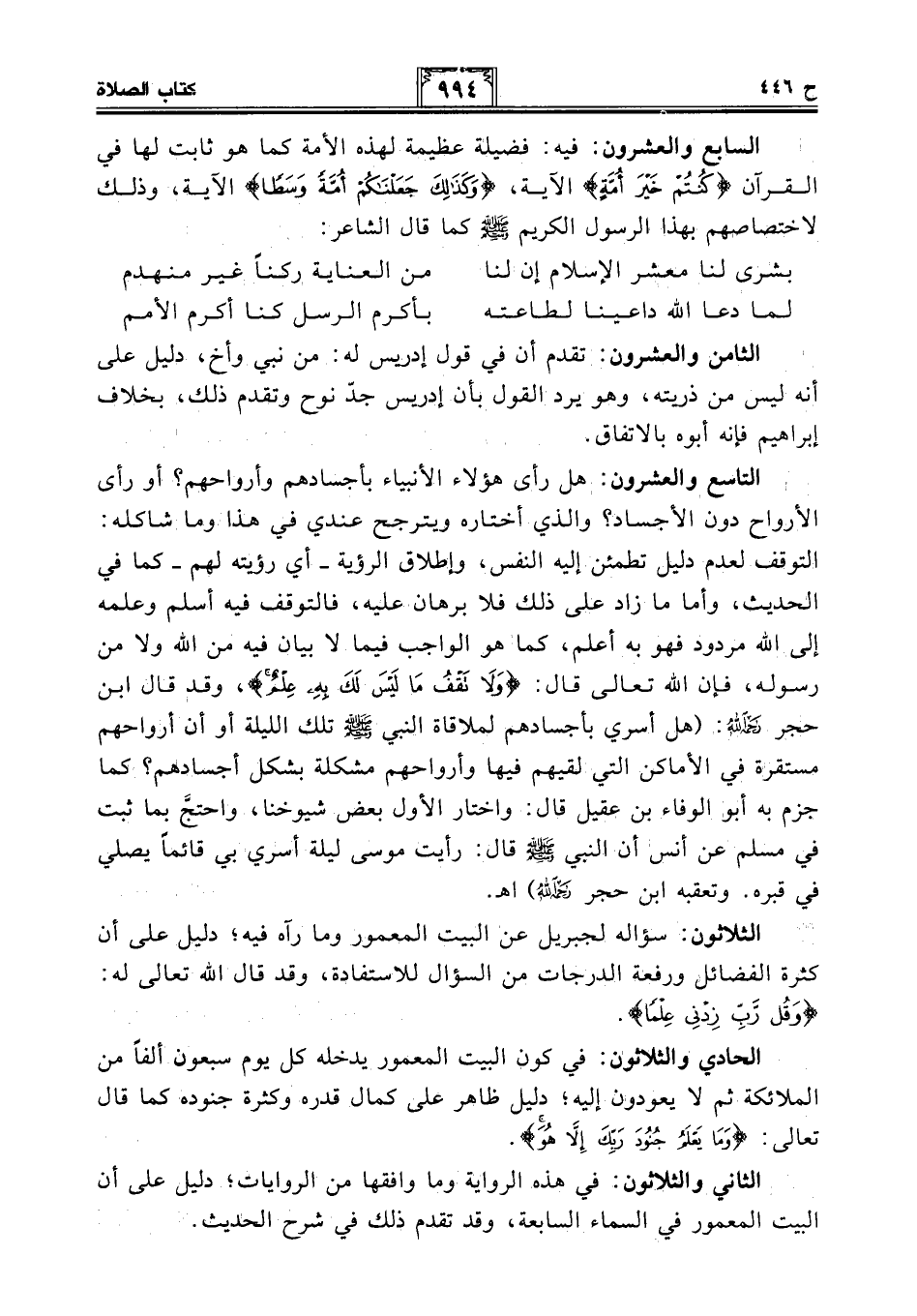 التاسع والعشرون: هل رأى هؤلاء الأنبياء بأجسادهم وأرواحهم؟ أو رأى الأرواح دون الأجساد؟ والذي أختاره ويترجح عندي في هذا وما شاكله: التوقف لعدم دليل تطمئن إليه النفس، وإطلاق الرؤية -أي رؤيته لهم- كما في الحديث، وأما ما زاد على ذلك فلا برهان عليه، فالتوقف فيه أسلم وعلمه إلى الله مردود فهو به أعلم، كما هو الواجب فيما لا بيان فيه من الله ولا من رسوله، فإن الله تعالى قال: {وَلَا تَقْفُ مَا لَيْسَ لَكَ بِهِ عِلْمٌ}، وقد قال ابن حجر -رحمه الله-: (هل أسري بأجسادهم لملاقاة النبي - صلى الله عليه وسلم - تلك الليلة أو أن أرواحهم مستقرة في الأماكن التي لقيهم فيها وأرواحهم مشكلة بشكل أجسادهم؟ كما جزم به أبو الوفاء بن عقيل قال: واختار الأول بعض شيوخنا، واحتجَّ بما ثبت في مسلم عن أنس أن النبي - صلى الله عليه وسلم - قال: رأيت موسى ليلة أسري بي قائمًا يصلي في قبره. وتعقبه ابن حجر -رحمه الله-) اهـ.