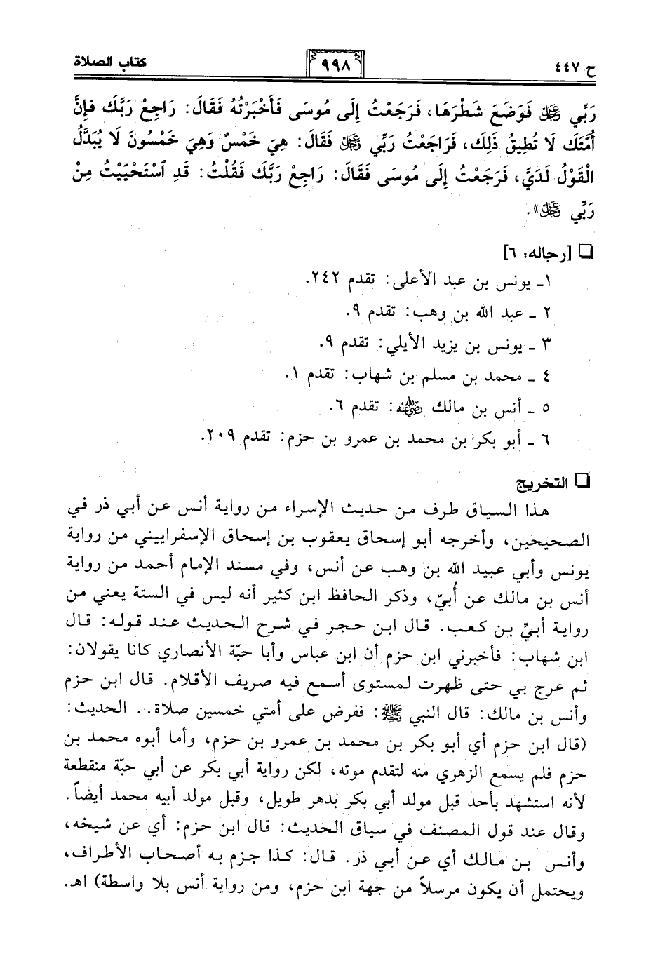 هذا السياق طرف من حديث الإسراء من رواية أنس عن أبي ذر في الصحيحين، وأخرجه أبو إسحاق يعقوب بن إسحاق الإسفراييني من رواية يونس وأبي عبيد الله بن وهب عن أنس، وفي مسند الإِمام أحمد من رواية أنس بن مالك عن أُبيّ، وذكر الحافظ ابن كثير أنه ليس في الستة يعني من رواية أبيِّ بن كعب. قال ابن حجر في شرح الحديث عند قوله: قال ابن شهاب: فأخبرني ابن حزم أن ابن عباس وأبا حبة الأنصاري كانا يقولان: ثم عرج بي حتى ظهرت لمستوى أسمع فيه صريف الأقلام. قال ابن حزم وأنس بن مالك: قال النبي - صلى الله عليه وسلم -: ففرض على أمتي خمسين صلاة .. الحديث: (قال ابن حزم أي أبو بكر بن محمَّد بن عمرو بن حزم، وأما أبوه محمَّد بن حزم فلم يسمع الزهري منه لتقدم موته، لكن رواية أبي بكر عن أبي حبّة منقطعة لأنه استشهد بأحد قبل مولد أبي بكر بدهر طويل، وقبل مولد أبيه محمَّد أيضًا. وقال عند قول المصنف في سياق الحديث: قال ابن حزم: أي عن شيخه، وأنس بن مالك أي عن أبي ذر. قال: كذا جزم به أصحاب الأطراف، ويحتمل أن يكون مرسلًا من جهة ابن حزم، ومن رواية أنس بلا واسطة) اهـ.