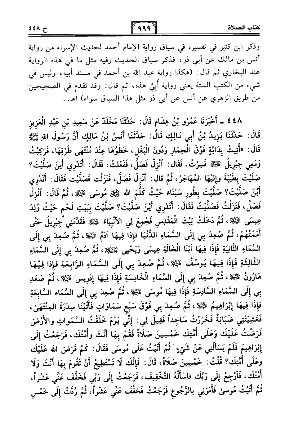 448 - أَخْبَرَنَا عَمْرُو بْنُ هِشَامٍ قَالَ: حَدَّثَنَا مَخْلَدٌ عَنْ سَعِيدِ بْنِ عَبْدِ الْعَزِيزِ قَالَ: حَدَّثَنَا يَزِيدُ بْنُ أَبِي مَالِكٍ قَالَ: حَدَّثَنَا أَنَسُ بْنُ مَالِكٍ أَنَّ رَسُولَ اللَّهِ - صلى الله عليه وسلم - قَالَ: "أُتِيتُ بِدَابَّةٍ فَوْقَ الْحِمَارِ وَدُونَ الْبَغْلِ، خَطْوُهَا عِنْدَ مُنْتَهَى طَرْفِهَا، فَرَكِبْتُ وَمَعِي جِبْرِيلُ -عَلَيْهِ السَّلَامُ- فَسِرْتُ، فَقَالَ: انْزِلْ فَصَلِّ، فَفَعَلْتُ، فَقَالَ: أَتَدْرِي أَيْنَ صَلَّيْتَ؟ صَلَّيْتَ بِطَيْبَةَ وَإِلَيْهَا الْمُهَاجَرُ، ثُمَّ قَالَ: انْزِلْ فَصَلِّ، فنزلت فَصَلَّيْتُ فَقَالَ: أَتَدْرِي أَيْنَ صَلَّيْتَ؟ صَلَّيْتَ بِطُورِ سَيْنَاءَ حَيْثُ كَلَّمَ اللَّهُ -عَزَّ وَجَلَّ- مُوسَى -عَلَيْهِ السَّلَامُ-، ثُمَّ قَالَ: انْزِلْ فَصَلِّ، فَنَزَلْتُ فَصَلَّيْتُ فَقَالَ: أَتَدْرِي أَيْنَ صَلَّيْتَ؟ صَلَّيْتَ بِبَيْتِ لَحْمٍ حَيْثُ وُلِدَ عِيسَى -عَلَيْهِ السَّلَامُ-، ثُمَّ دَخَلْتُ بَيْتَ الْمَقْدِسِ فَجُمِعَ لِيَ الأَنْبِيَاءُ -عَلَيْهِمُ السَّلَامُ- فَقَدَّمَنِي جِبْرِيلُ حَتَّى أَمَمْتُهُمْ، ثُمَّ صُعِدَ بِي إِلَى السَّمَاءِ الدُّنْيَا فَإِذَا فِيهَا آدَمُ -عَلَيْهِ السَّلَامُ-، ثُمَّ صُعِدَ بِي إِلَى السَّمَاءِ الثَّانِيَةِ فَإِذَا فِيهَا ابْنَا الْخَالَةِ عِيسَى وَيَحْيَى -عَلَيْهِمَا السَّلَامُ-، ثُمَّ صُعِدَ بِي إِلَى السَّمَاءِ الثَّالِثَةِ فَإِذَا فِيهَا يُوسُفُ -عَلَيْهِ السَّلَامُ-، ثُمَّ صُعِدَ بِي إِلَى السَّمَاءِ الرَّابِعَةِ فَإِذَا فِيهَا هَارُونُ -عَلَيْهِ السَّلَامُ-، ثُمَّ صُعِدَ بِي إِلَى السَّمَاءِ الْخَامِسَةِ فَإِذَا فِيهَا إِدْرِيسُ -عَلَيْهِ السَّلَامُ-، ثُمَّ صُعِدَ بِي إِلَى السَّمَاءِ السَّادِسَةِ فَإِذَا فِيهَا مُوسَى -عَلَيْهِ السَّلَامُ-، ثُمَّ صُعِدَ بِي إِلَى السَّمَاءِ السَّابِعَةِ فَإِذَا فِيهَا إِبْرَاهِيمُ -عَلَيْهِ السَّلَامُ-، ثُمَّ صُعِدَ بِي فَوْقَ سَبْعِ سَمَوَاتٍ فَأَتَيْنَا سِدْرَةَ الْمُنْتَهَى، فَغَشِيَتْنِي ضَبَابَةٌ فَخَرَرْتُ سَاجِدًا فَقِيلَ لِي: إِنِّي يَوْمَ خَلَقْتُ السَّمَوَاتِ وَالأَرْضَ فَرَضْتُ عَلَيْكَ وَعَلَى أُمَّتِكَ خَمْسِينَ صَلَاةً فَقُمْ بِهَا أَنْتَ وَأُمَّتُكَ، فَرَجَعْتُ إِلَى إِبْرَاهِيمَ فَلَمْ يَسْأَلْنِي عَنْ شَيْءٍ. ثُمَّ أَتَيْتُ عَلَى مُوسَى فَقَالَ: كَمْ فَرَضَ اللَّهُ عَلَيْكَ وَعَلَى أُمَّتِكَ؟ قُلْتُ: خَمْسِينَ صَلَاةً، قَالَ: فَإِنَّكَ لَا تَسْتَطِيعُ أَنْ تَقُومَ بِهَا أَنْتَ وَلَا أُمَّتُكَ، فَارْجِعْ إِلَى رَبِّكَ فَاسْأَلْهُ التَّخْفِيفَ، فَرَجَعْتُ إِلَى رَبِّي فَخَفَّفَ عَنِّي عَشْرًا، ثُمَّ أَتَيْتُ مُوسَى فَأَمَرَنِي بِالرُّجُوعِ فَرَجَعْتُ فَخَفَّفَ عَنِّي عَشْرًا، ثُمَّ رُدَّتْ إِلَى خَمْسِ