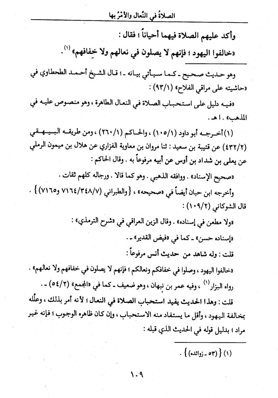 " خالفوا اليهود، وصلوا في خفافكم ونعالكم؛ فإنهم لا يصلون في خفافهم ولا نعالهم ".