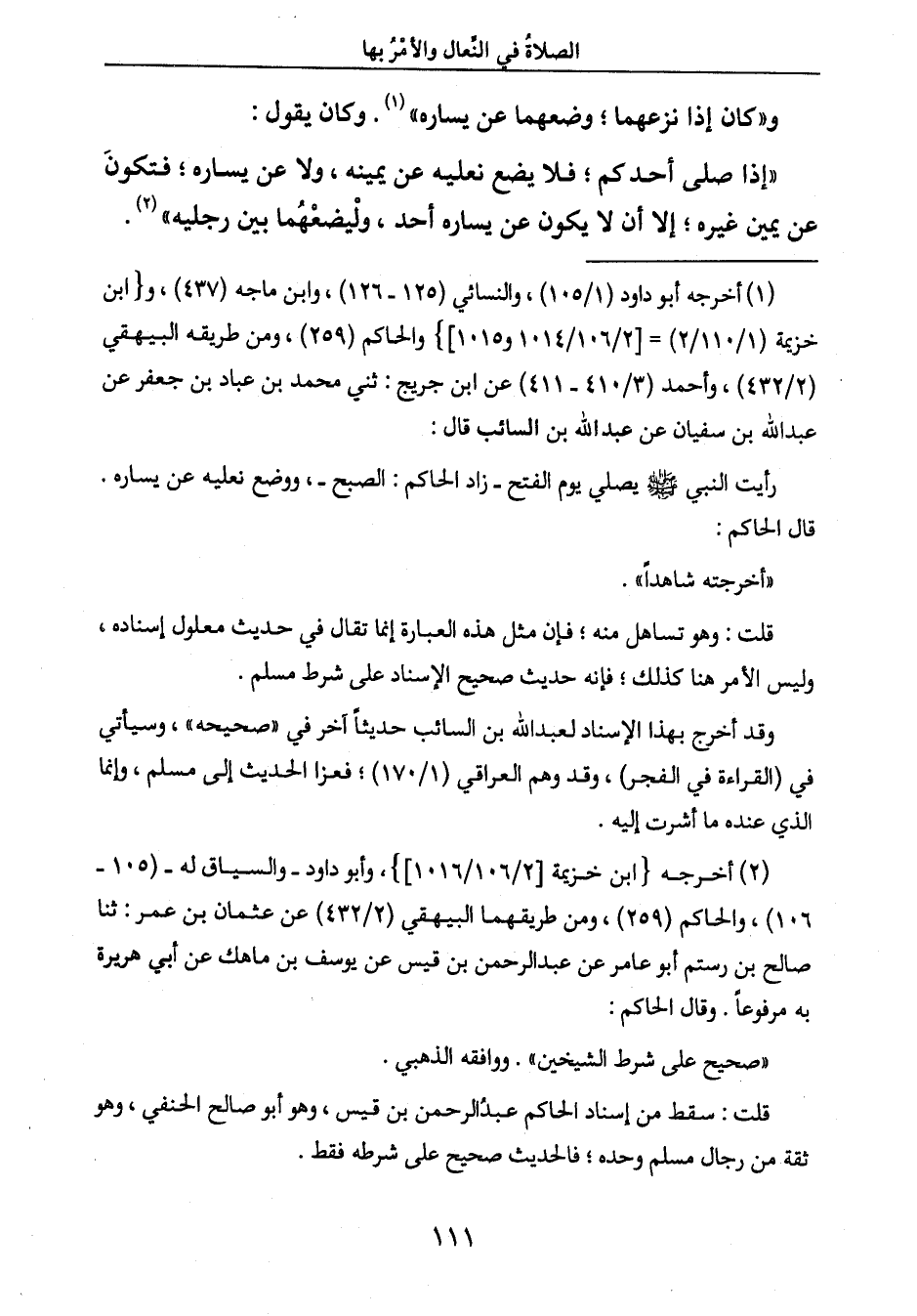 رأيت النبي صَلَّى اللَّهُ عَلَيْهِ وَسَلَّمَ يصلي يوم الفتح - زاد الحاكم: الصبح -، ووضع نعليه عن يساره.