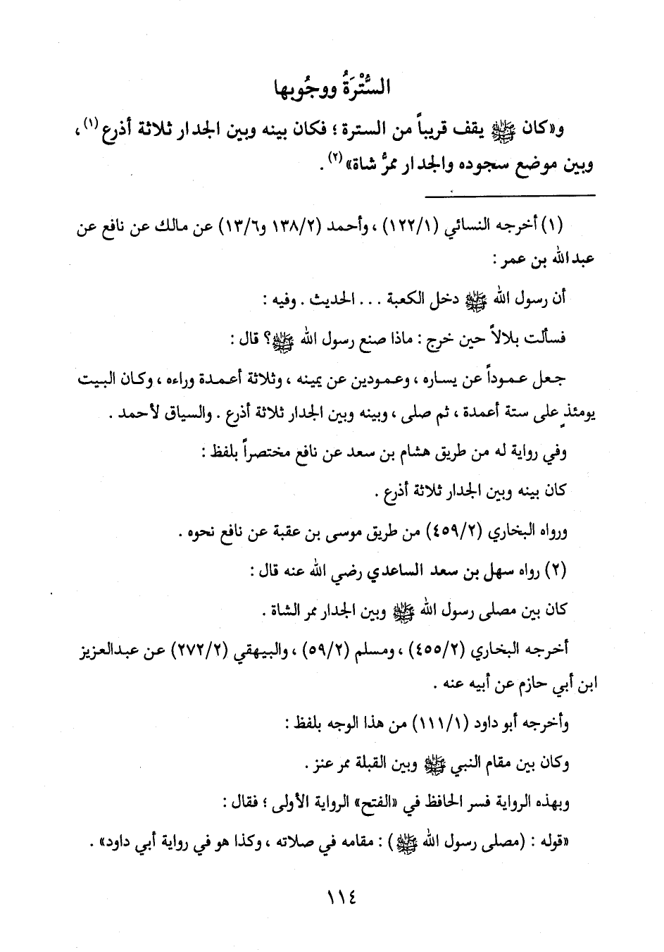 و" كان صَلَّى اللَّهُ عَلَيْهِ وَسَلَّمَ يقف قريباً من السترة؛ فكان بينه وبين الجدار ثلاثة أذرع (1) ،