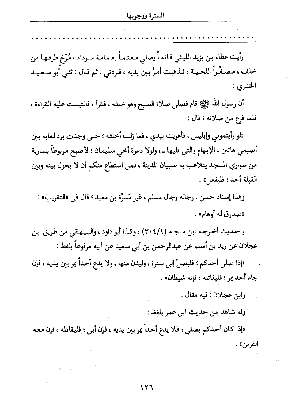 " إذا صلى أحدكم؛ فليصلِّ إلى سترة، وليدن منها، ولا يدع أحداً يمر بين يديه، فإن