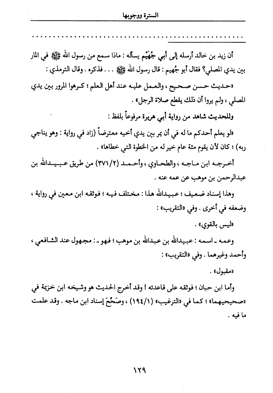 بين يدي المصلي؟ فقال أبو جُهيم: قال رسول الله صَلَّى اللَّهُ عَلَيْهِ وَسَلَّمَ ... فذكره. وقال الترمذي: