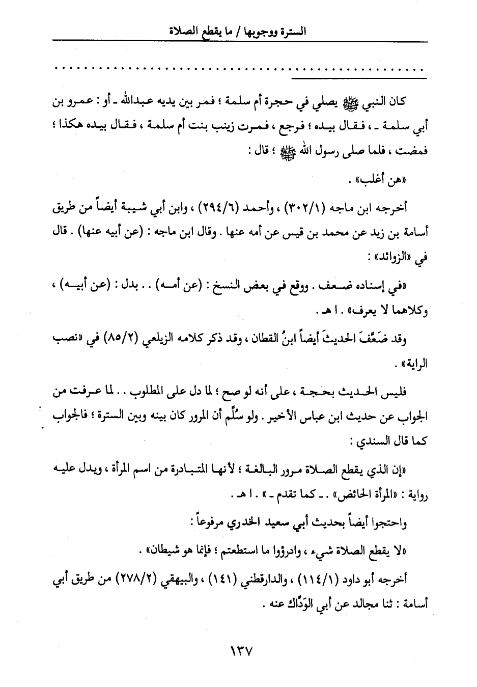 كان النبي صَلَّى اللَّهُ عَلَيْهِ وَسَلَّمَ يصلي في حجرة أم سلمة؛ فمر بين يديه عبد الله - أو: عمرو بن