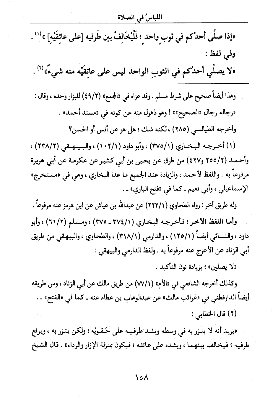 " لا يصلِّي أحدُكم في الثوبِ الواحد ليس على عاتِقَيْه منه شيءٌ " (2) .