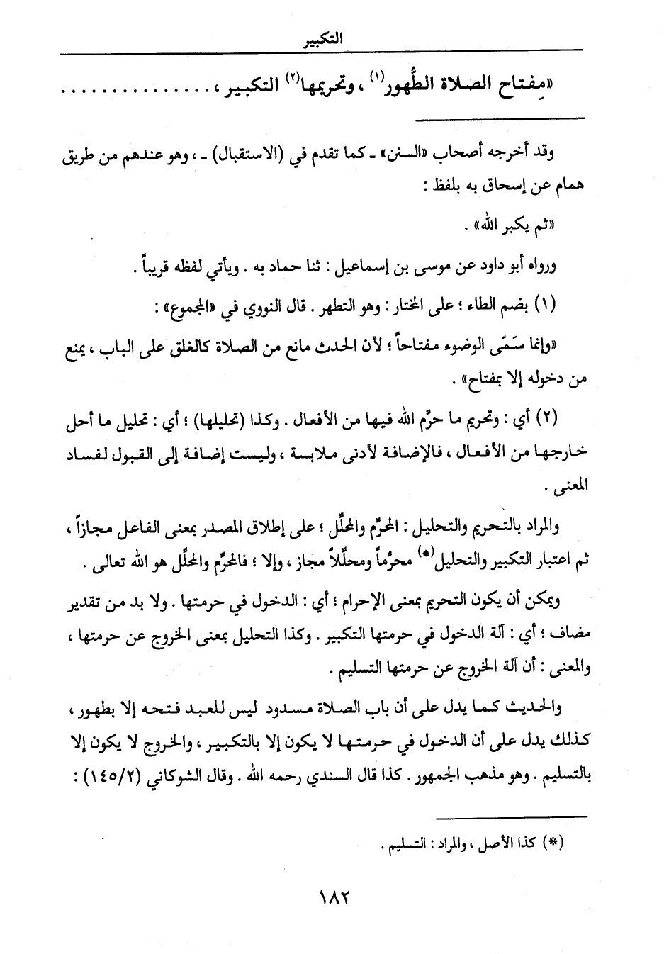 ثم اعتبار التكبير والتحليل (*) محرِّماً ومحلِّلاً مجاز، وإلا؛ فالمحرِّم والمحلِّل هو الله تعالى.