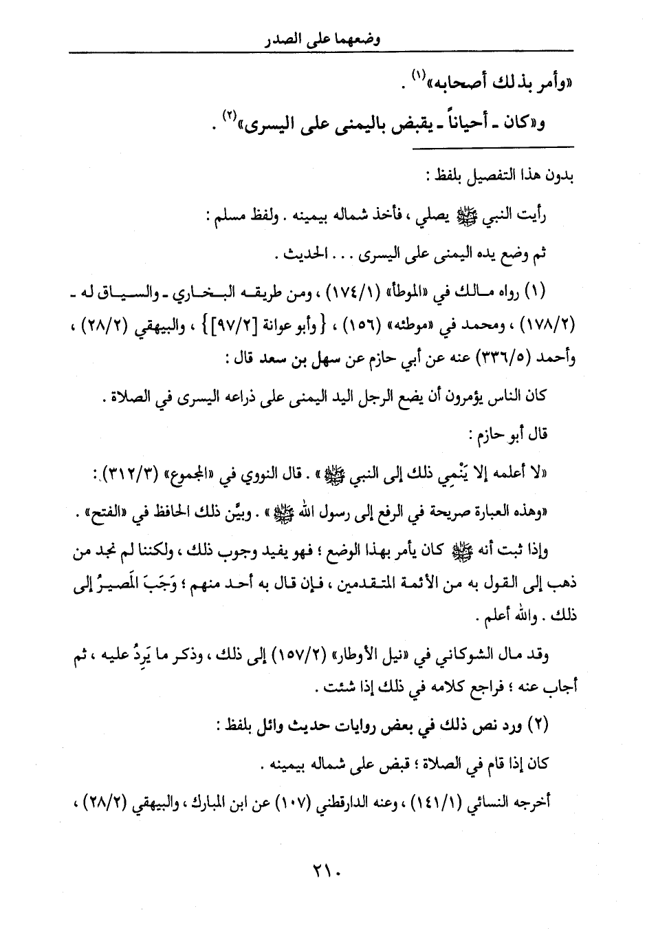 رأيت النبي صَلَّى اللَّهُ عَلَيْهِ وَسَلَّمَ يصلي، فأخذ شماله بيمينه. ولفظ مسلم: