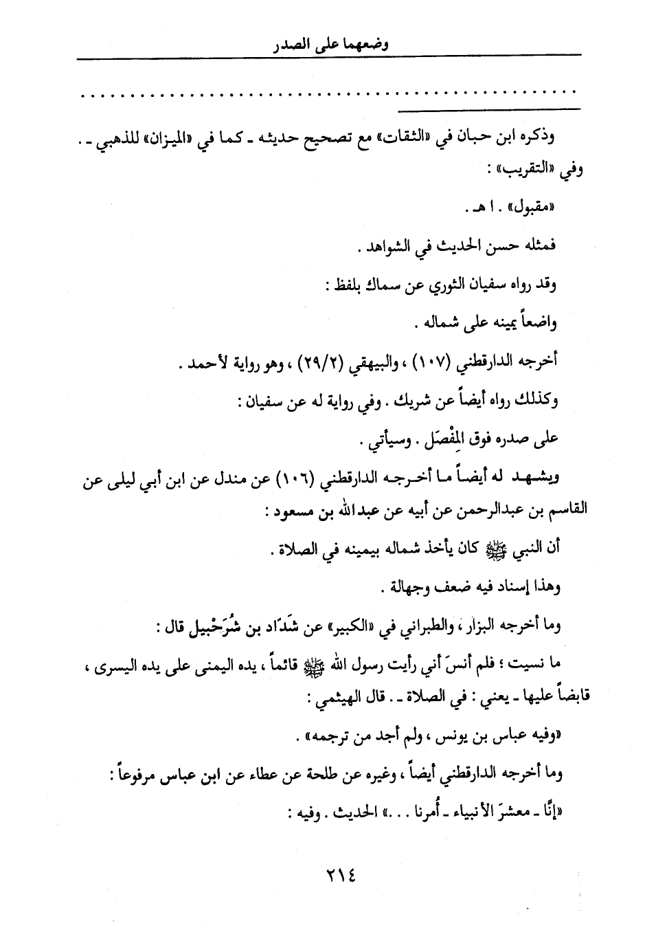 أن النبي صَلَّى اللَّهُ عَلَيْهِ وَسَلَّمَ كان يأخذ شماله بيمينه في الصلاة.