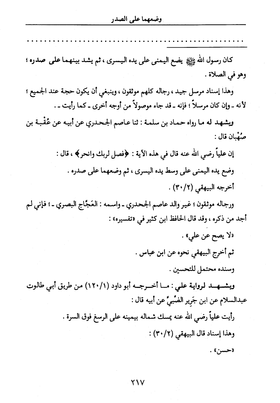 رأيت علياً رضي الله عنه يمسك شماله بيمينه على الرسغ فوق السرة.
