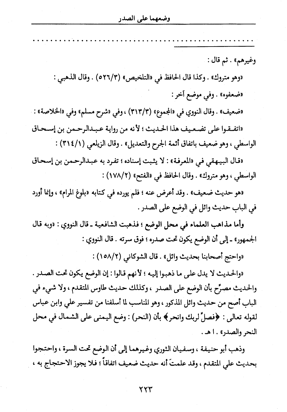 " والحديث لا يدل على ما ذهبوا إليه؛ لأنهم قالوا: إن الوضع يكون تحت الصدر.