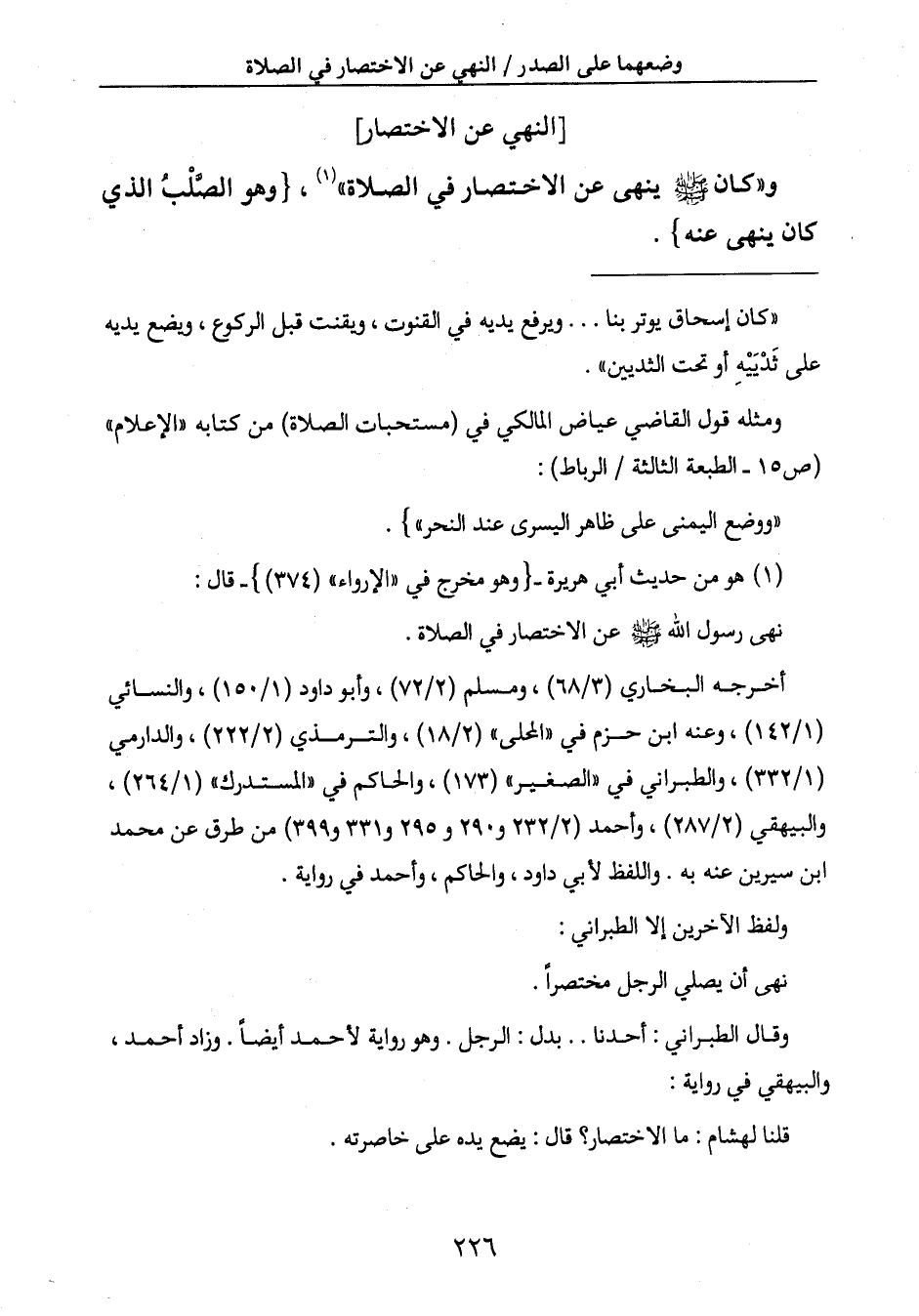 و" كان صَلَّى اللَّهُ عَلَيْهِ وَسَلَّمَ ينهى عن الاختصار في الصلاة " (1) ، {وهو الصَّلْبُ الذي