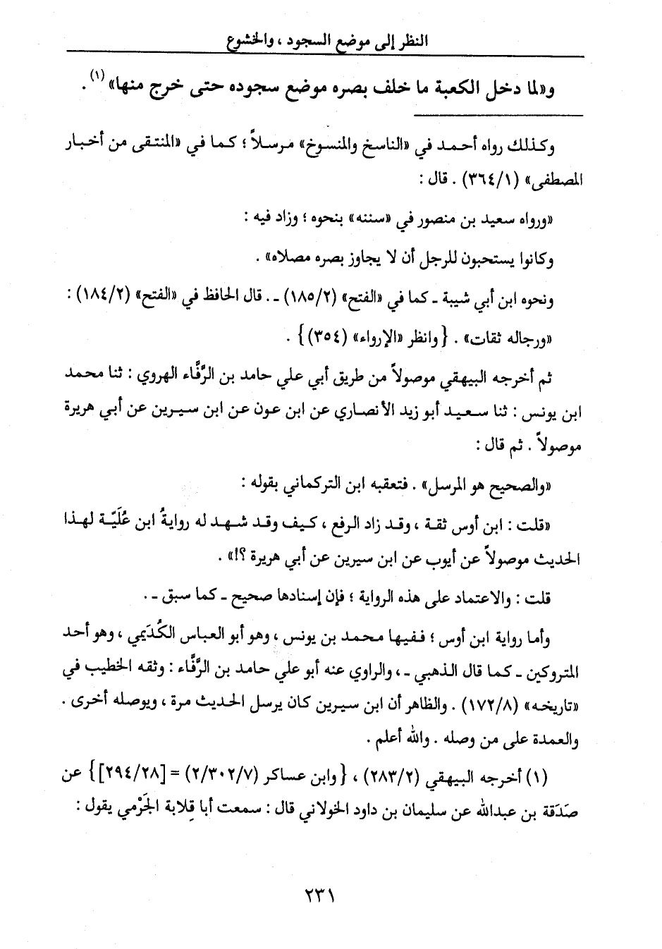 وكانوا يستحبون للرجل أن لا يجاوز بصره مصلاه ".