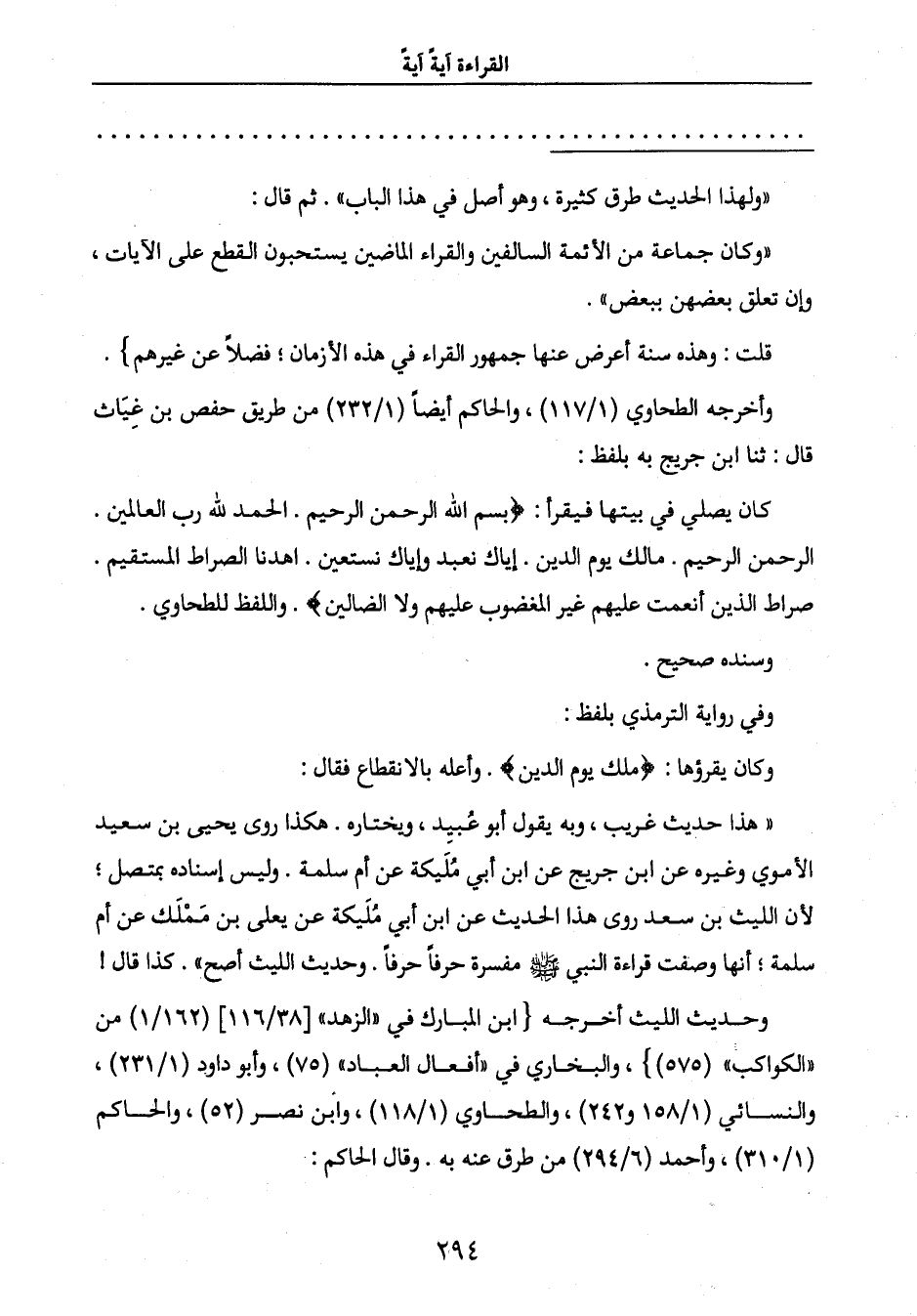 سلمة؛ أنها وصفت قراءة النبي صَلَّى اللَّهُ عَلَيْهِ وَسَلَّمَ مفسرة حرفاً حرفاً. وحديث الليث أصح ". كذا قال!
