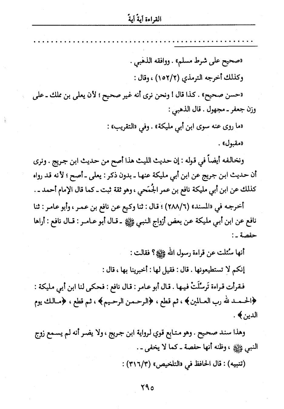 فقرأت قراءة تَرسَّلَتْ فيها. قال أبو عامر: قال نافع: فحكى لنا ابن أبي مليكة:
