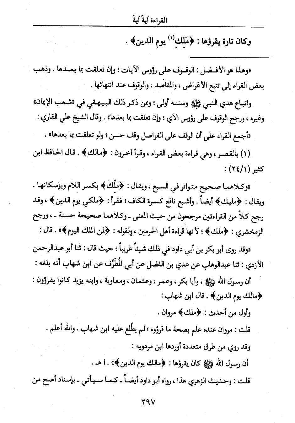 أن رسول الله صَلَّى اللَّهُ عَلَيْهِ وَسَلَّمَ كان يقرؤها: {مَالِكِ يَوْمِ الدِّينِ} . اهـ.