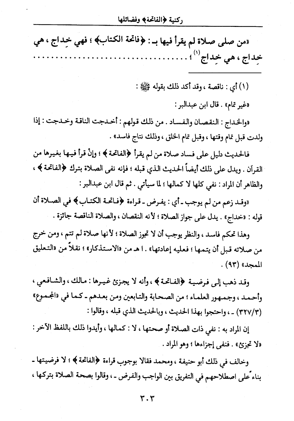 " وقد زعم من لم يوجب - أي: يفرض - قراءة {فاتحة الكتاب} في الصلاة أن
