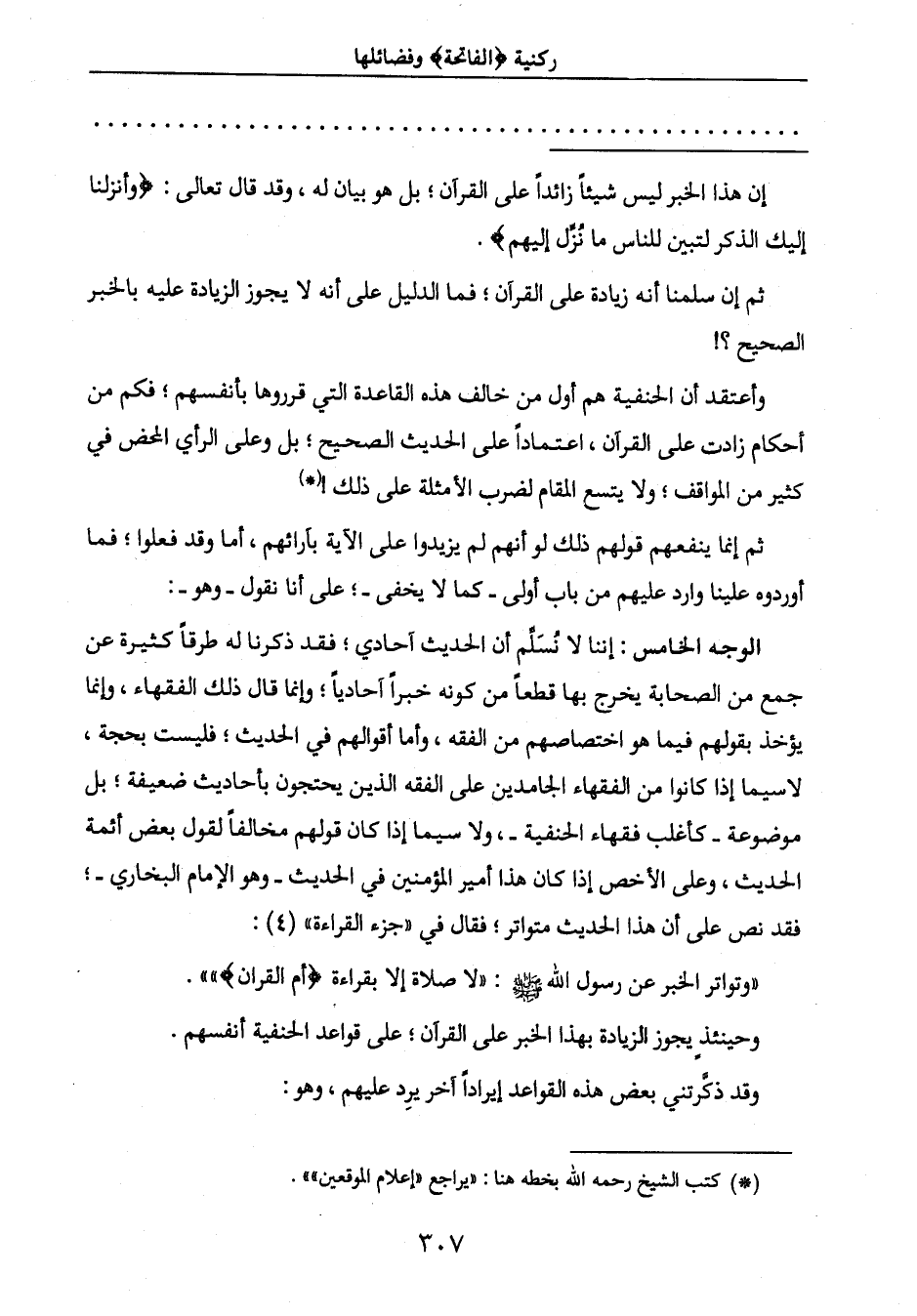 " وتواتر الخبر عن رسول الله صَلَّى اللَّهُ عَلَيْهِ وَسَلَّمَ: " لا صلاة إلا بقراءة {أم القرآن} " ".