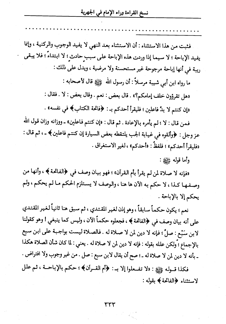 " إن كنتم لا بدَّ فاعلين؛ فليقرأ أحدكم بـ: {فاتحة الكتاب} في نفسه ".