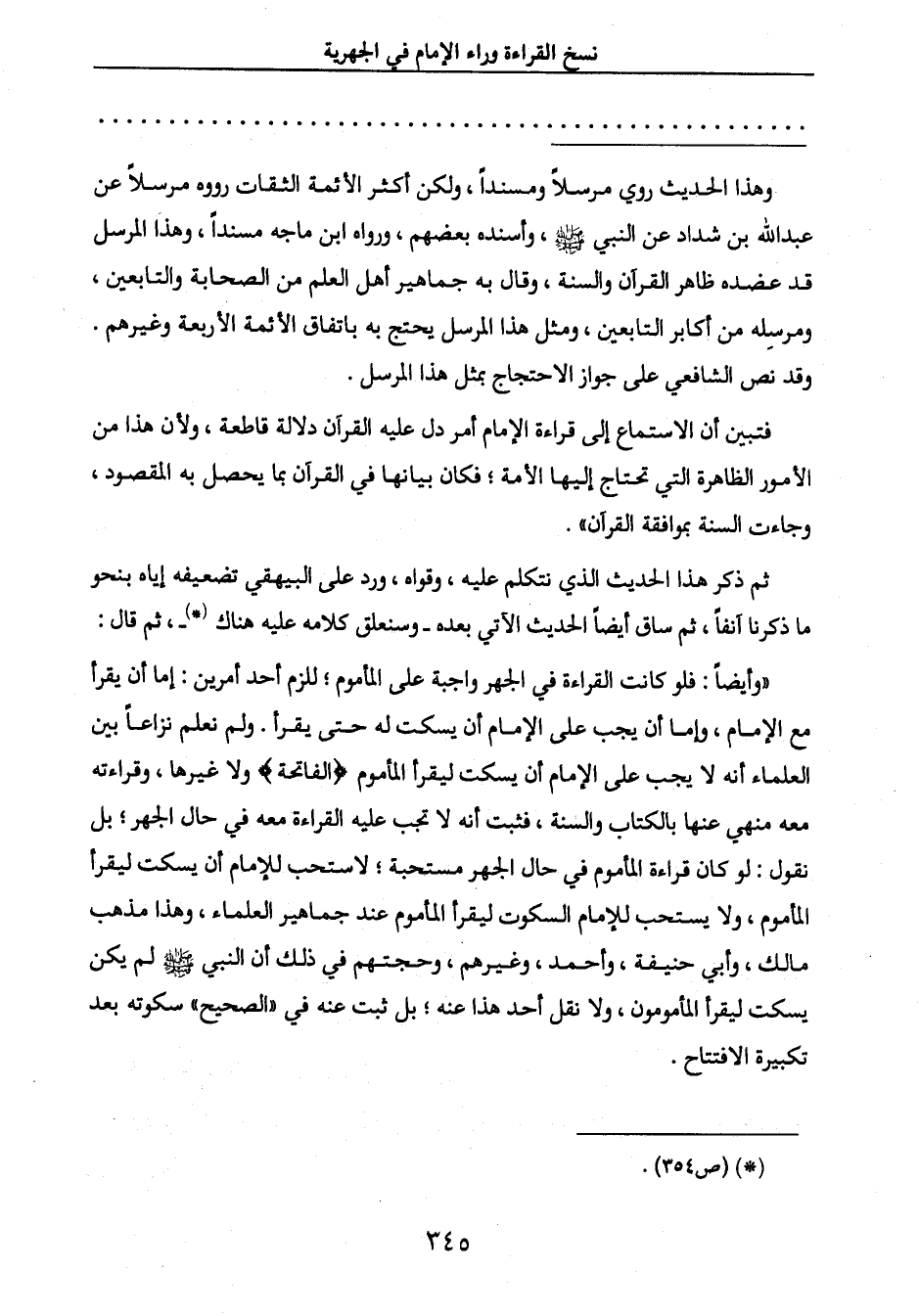 " وأيضاً: فلو كانت القراءة في الجهر واجبة على المأموم؛ للزم أحد أمرين: إما أن يقرأ