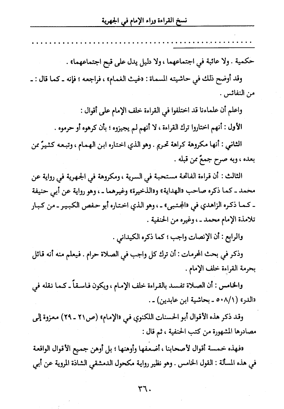 واعلم أن علماءنا قد اختلفوا في القراءة خلف الإمام على أقوال: