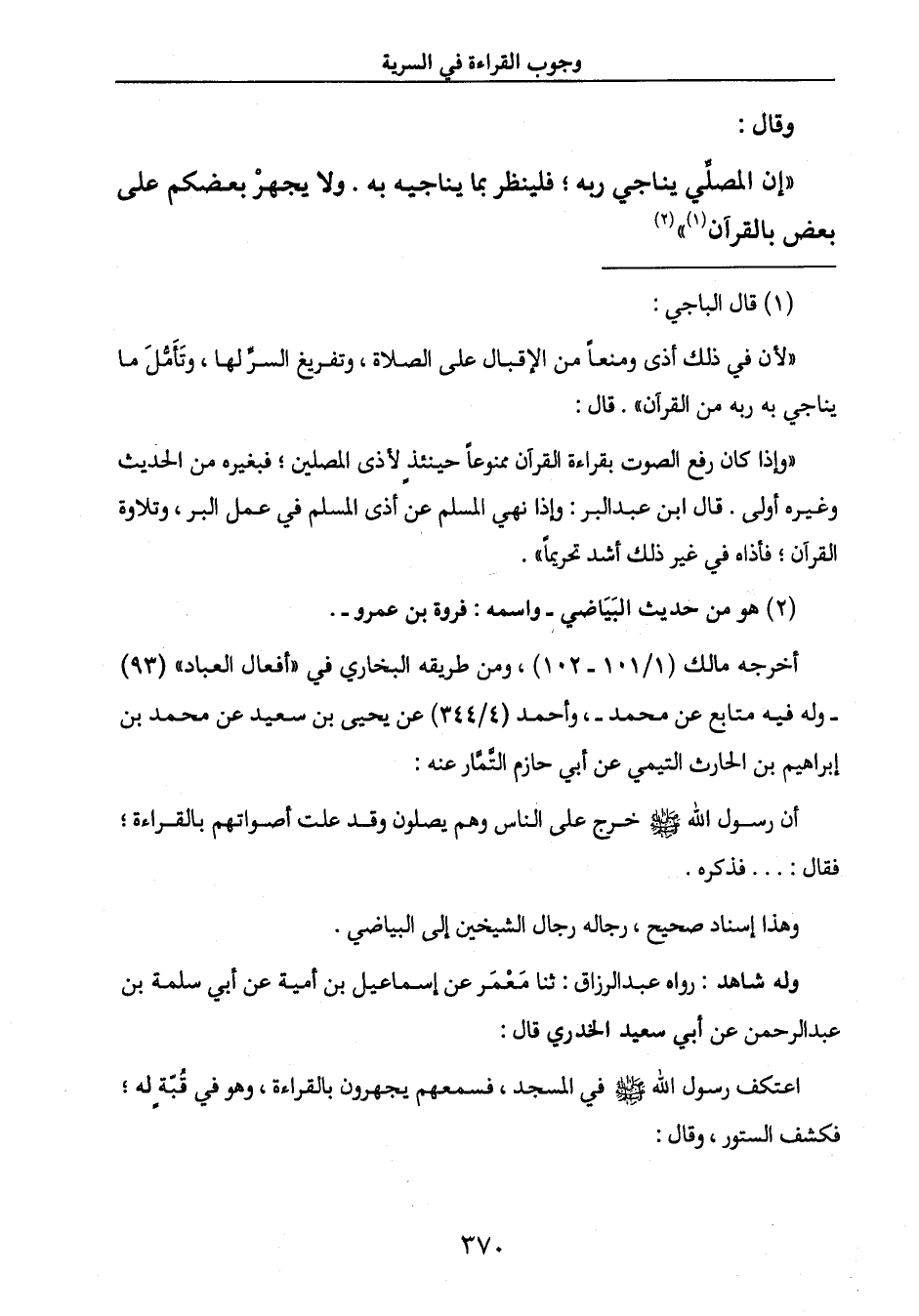 " إن المصلِّي يناجي ربه؛ فلينظر بما يناجيه به. ولا يجهرْ بعضكم على