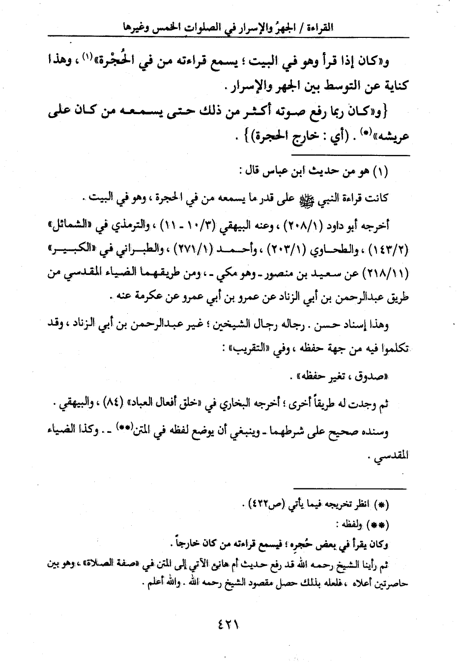 كانت قراءة النبي صَلَّى اللَّهُ عَلَيْهِ وَسَلَّمَ على قدر ما يسمعه من في الحجرة، وهو في البيت.