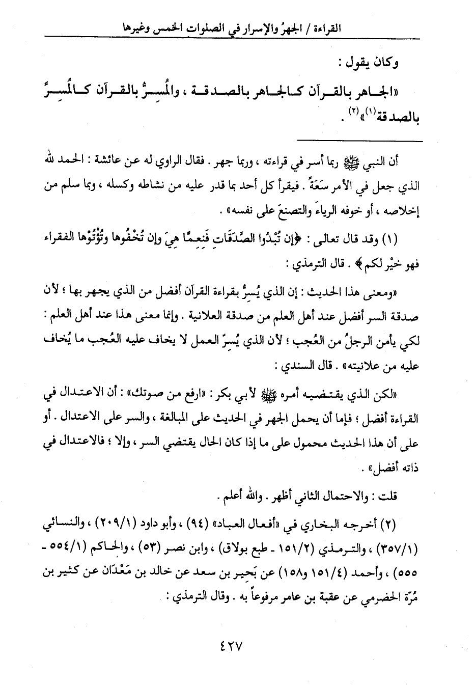 " الجاهر بالقرآن كالجاهر بالصدقة، والمُسِرُّ بالقرآن كالمُسِرِّ