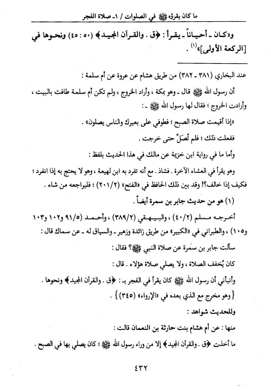 وأنبأني أن رسول الله صَلَّى اللَّهُ عَلَيْهِ وَسَلَّمَ كان يقرأ في الفجر بـ: {ق. وَالقُرْآنِ المَجِيدِ} ونحوها.