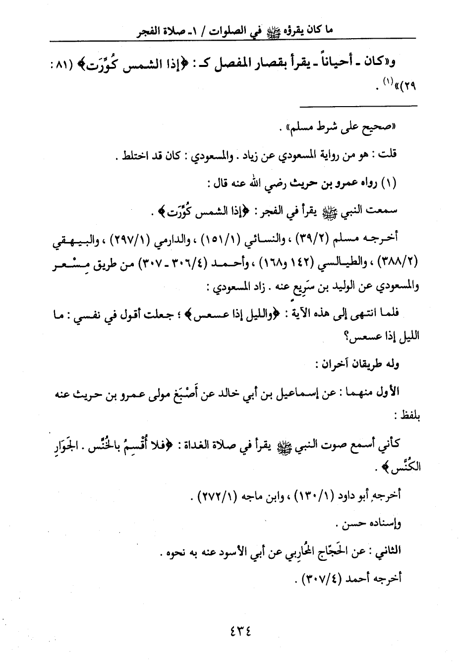 و " كان - أحياناً - يقرأ بقصار المفصل كـ: {إِذَا الشَّمْسُ كُوِّرَتْ} (81: