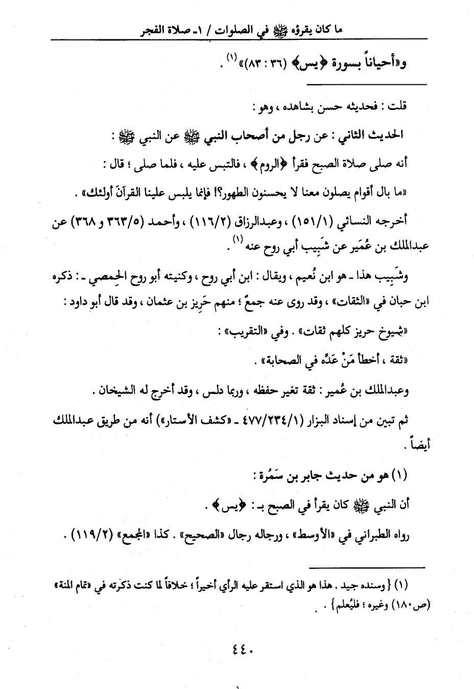 أن النيي صَلَّى اللَّهُ عَلَيْهِ وَسَلَّمَ كان يقرأ في الصبح بـ: {يس} .