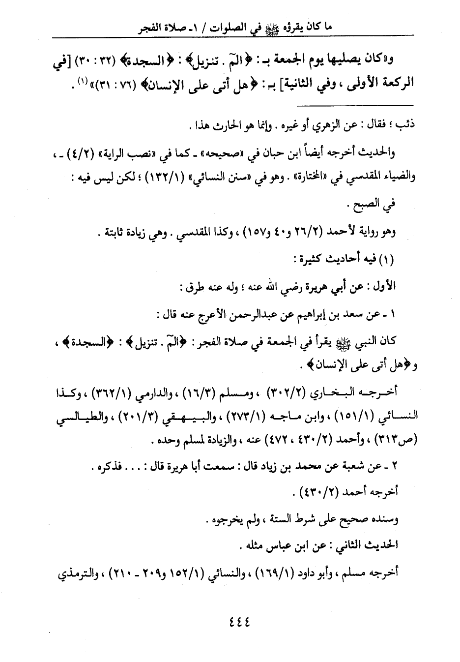 و " كان يصليها يوم الجمعة بـ: {الم. تَنْزِيلُ} : {السَّجْدَة} (32: 30) [في