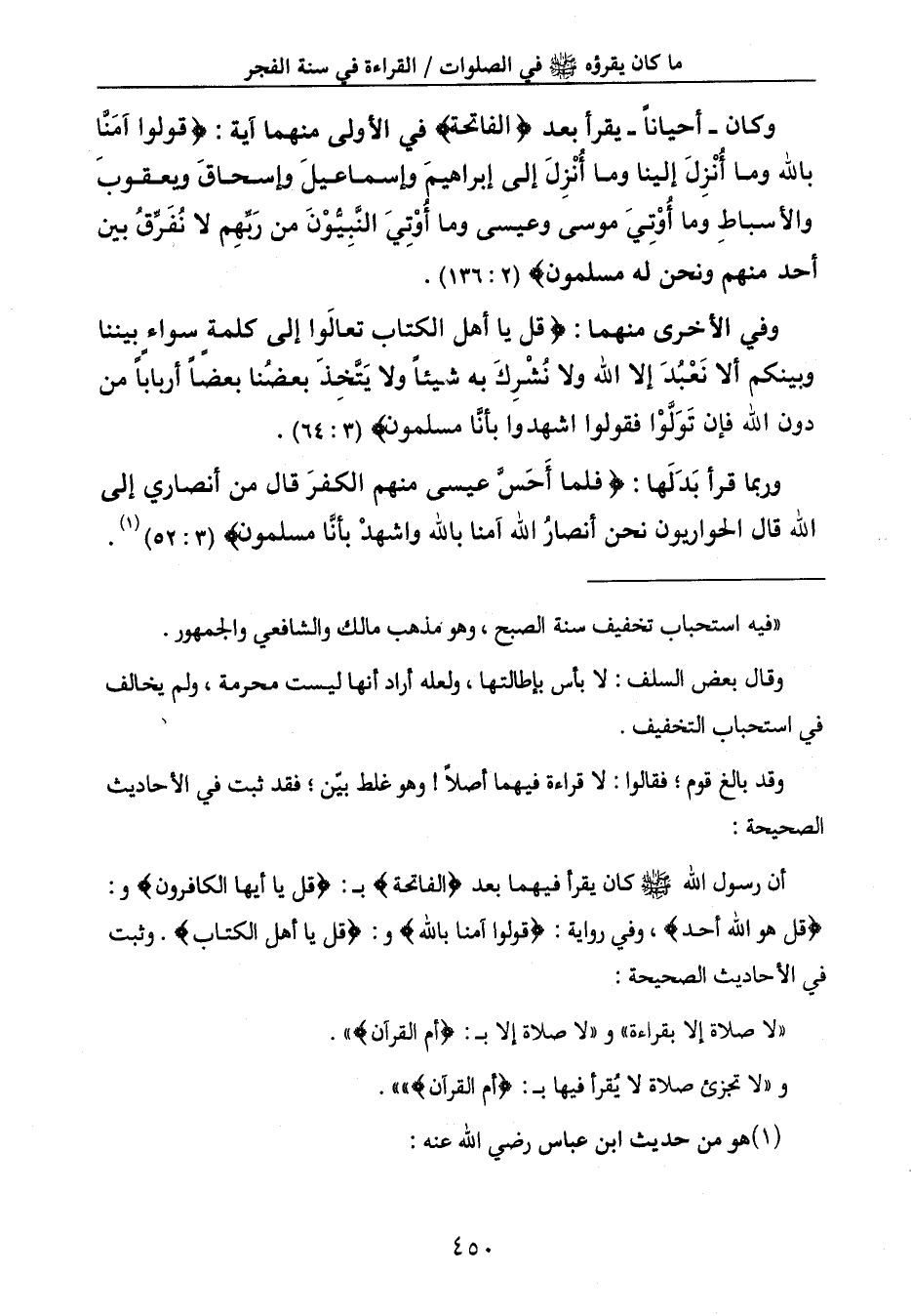 {قُلْ هُوَ اللَّهُ أَحَدٌ} ، وفي رواية: {قُولُوا آمَنَّا بِاللَّهِ} و: {قُلْ يَا أَهْلَ الكِتَابِ} . وثبت