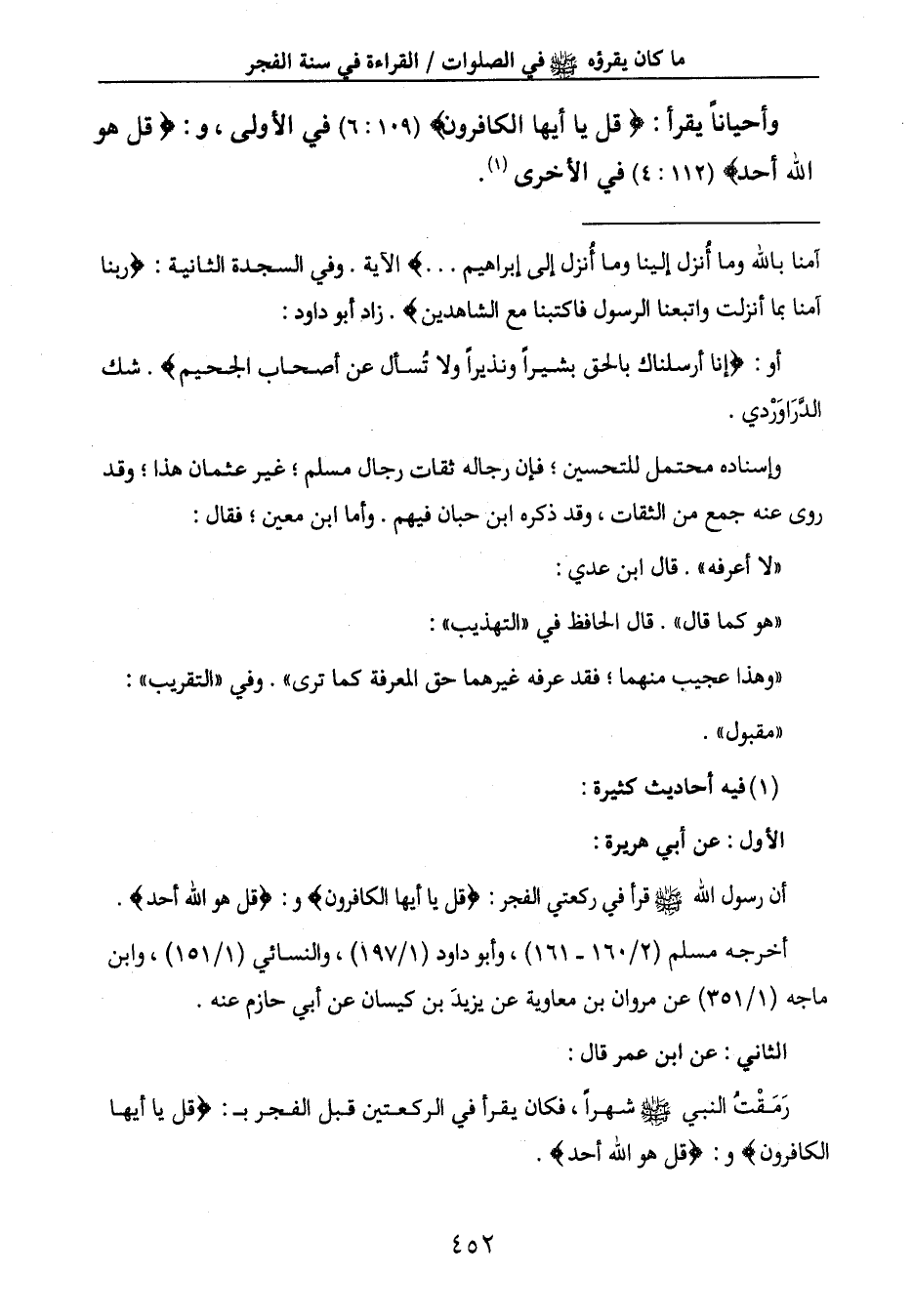 أن رسول الله صَلَّى اللَّهُ عَلَيْهِ وَسَلَّمَ قرأ في ركعتي الفجر: {قُلْ يَا أَيُّهَا الكَافِرُونَ} و: {قُلْ هُوَ اللَّهُ أَحَدٌ} .