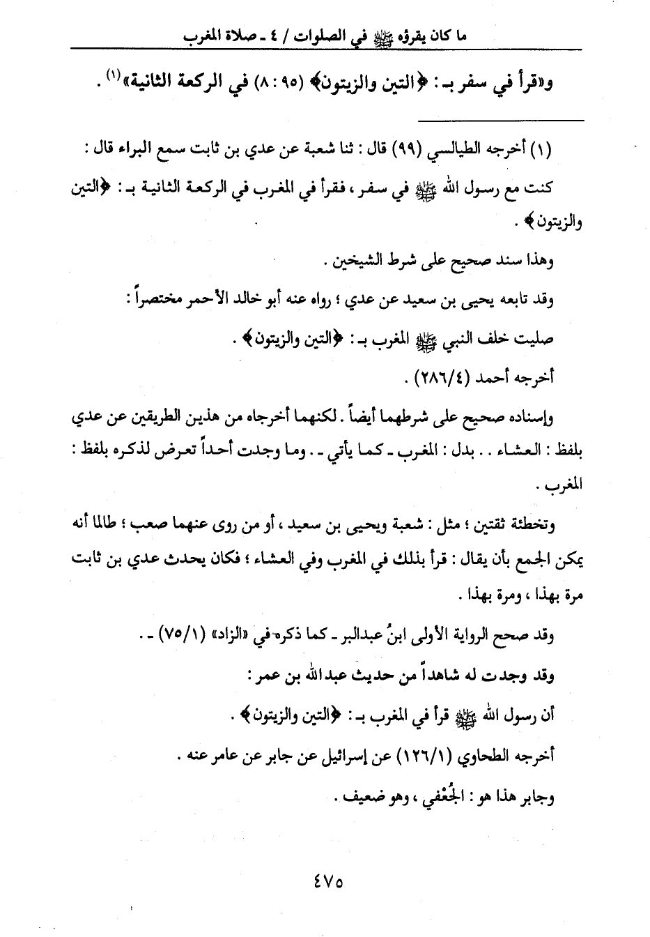 و " قرأ في سفر بـ: {التِّينِ وَالزَّيْتُونِ} (95: 8) في الركعة الثانية " (1) .