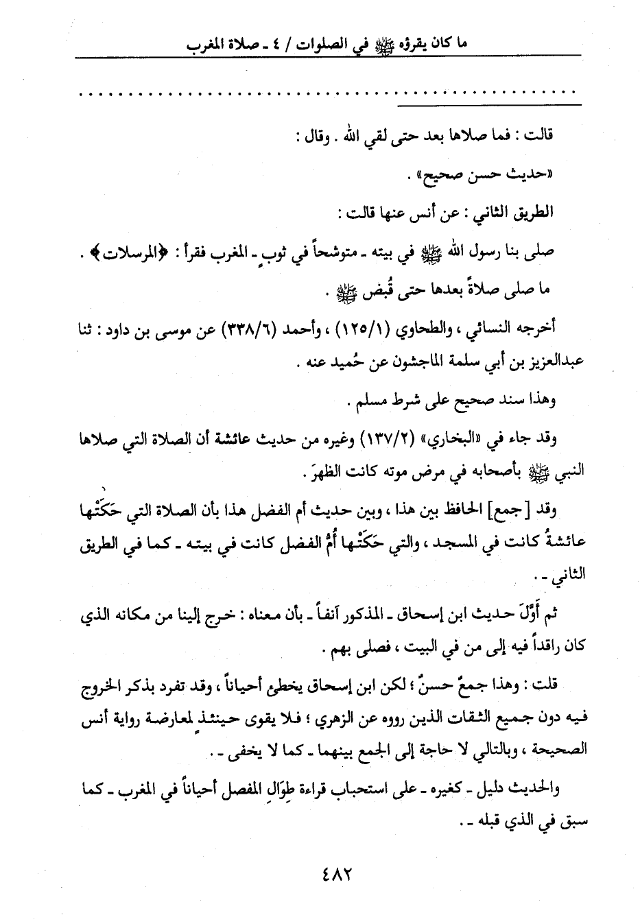 صلى بنا رسول الله صَلَّى اللَّهُ عَلَيْهِ وَسَلَّمَ في بيته - متوشحاً في ثوبٍ - المغرب فقرأ: {المُرْسَلَات} .