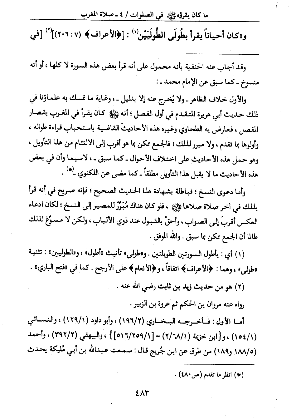 و " كان أحياناً يقرأ بطُولَى الطُّولَيَيْن (1) : [ {الأَعْرَاف} (7: 206) ] (2) [في