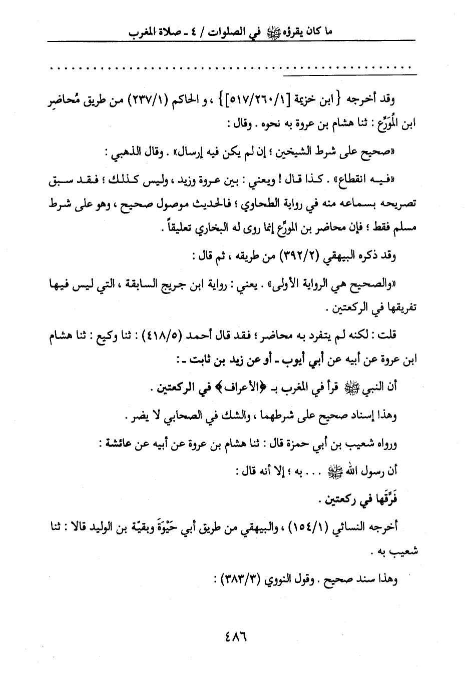 أن النبي صَلَّى اللَّهُ عَلَيْهِ وَسَلَّمَ قرأ في المغرب بـ {الأَعْرَاف} في الركعتين.
