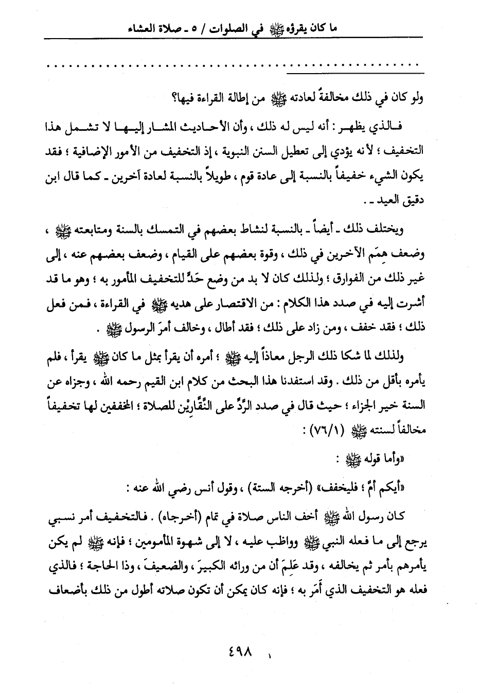 ولذلك لما شكا ذلك الرجل معاذاً إليه صَلَّى اللَّهُ عَلَيْهِ وَسَلَّمَ؛ أمره أن يقرأ بمثل ما كان صَلَّى اللَّهُ عَلَيْهِ وَسَلَّمَ يقرأ، فلم
