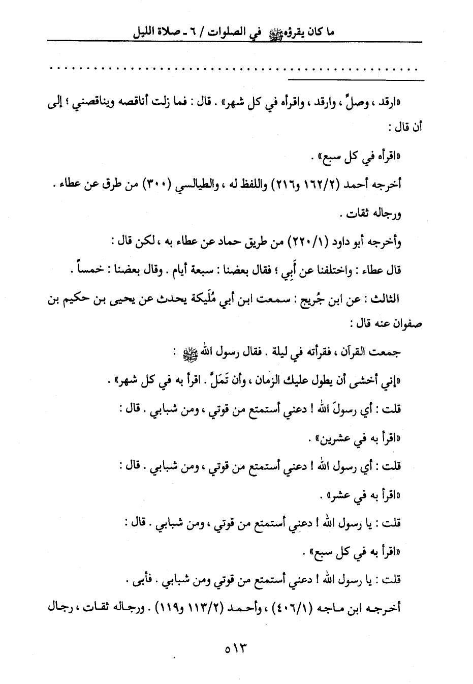 " ارقد، وصلِّ، وارقد، واقرأه في كل شهر ". قال: فما زلت أناقصه ويناقصني؛ إلى