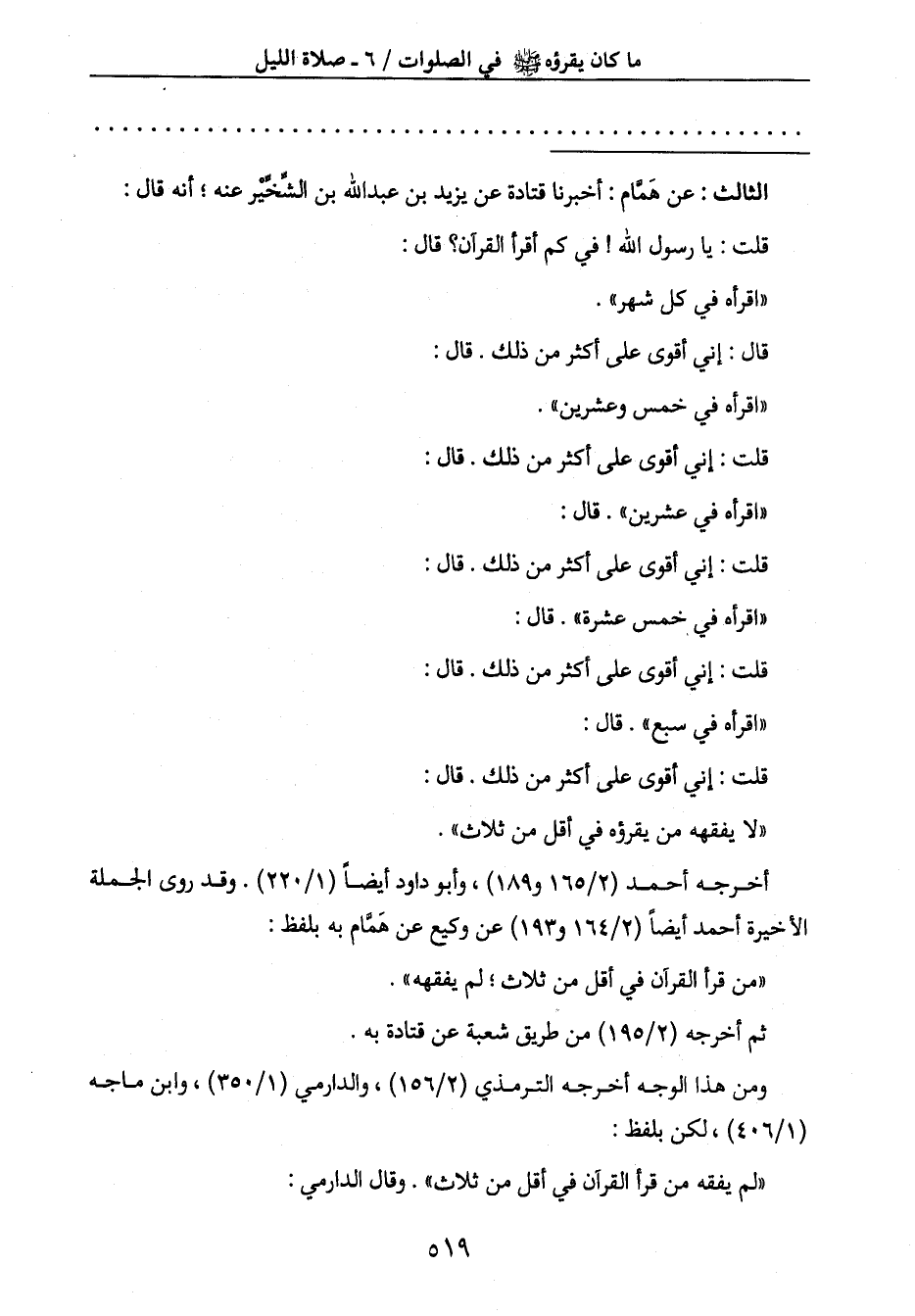 " لا يفقهه من يقرؤه في أقل من ثلاث ".